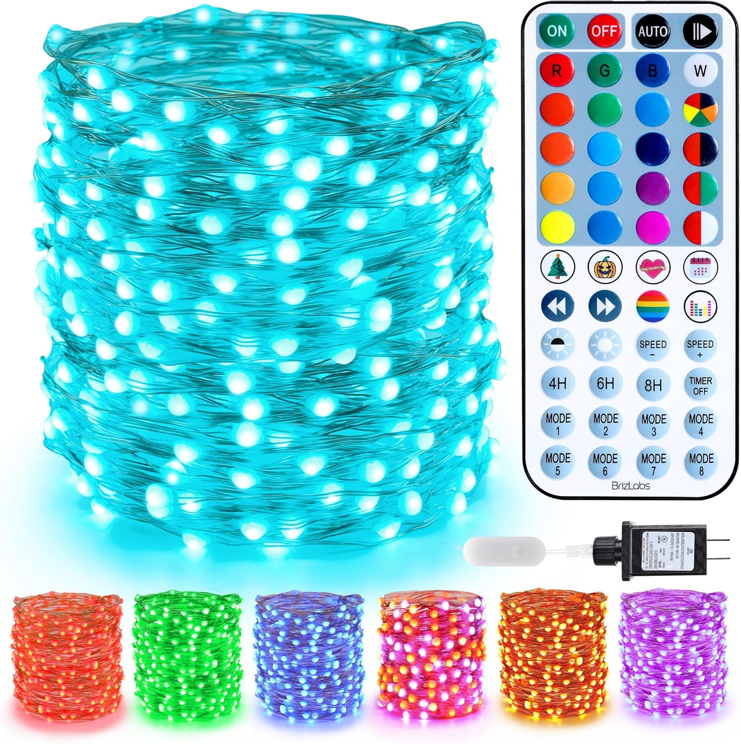 - Different Timer Options & Memory Function: Color changing string lights have a memory function, no need to repeat settings. Set "4H" "6H"& “8H” by remote, the Christmas fairy lights will be automatically on for 4/6/8 hours and off for 20/18/16 hours per day. Press the "Time OFF", and the timer will be canceled. Note】While the timer is activated, the blue indicator light inside the adapter will be on; while the timer is canceled, the blue indicator light is off.