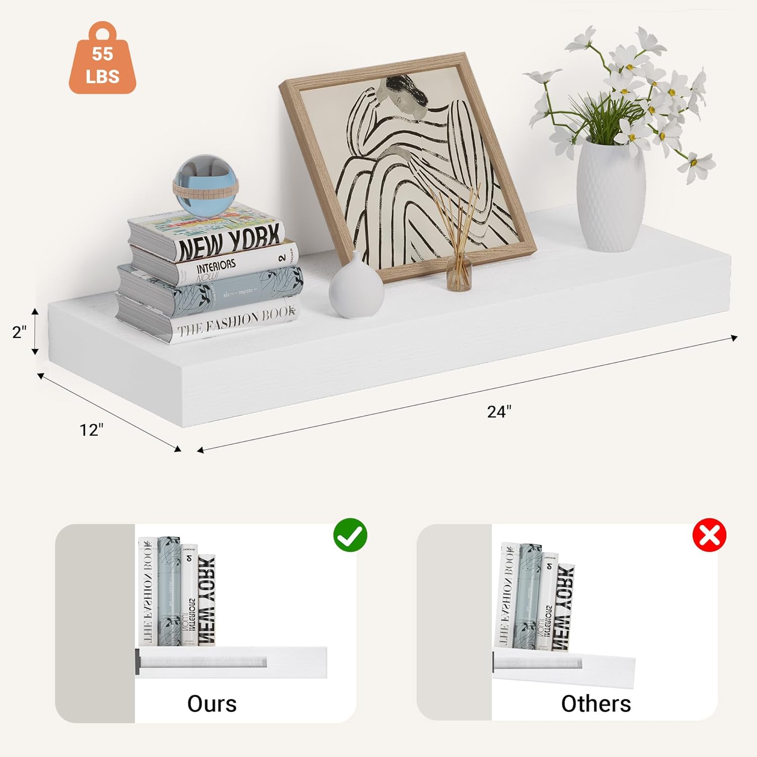 Heimlove 24 x 12 Inch Deep Floating Shelves Wall Mounted with Invisible Brackets,Storage Hanging Shelf for Wall Decor in Bathroom, Bedroom, Toilet, Kitchen, Living Room, Office Set of 1 (White)