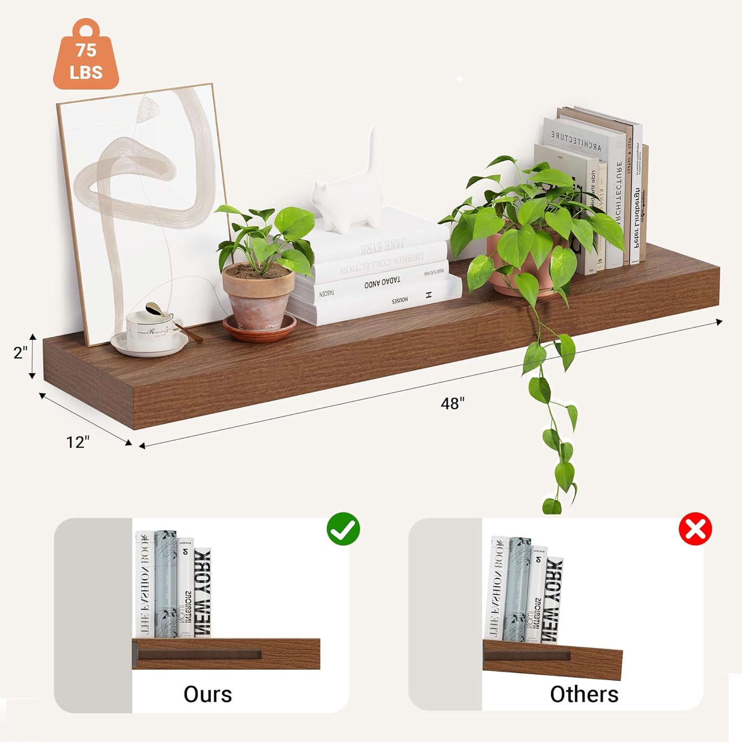 Heimlove 12 Inch Deep Floating Shelves, 48 x 12 inches Long Wall Shelf, Rustic Wood Wall Shelves for Fireplace Mantel, Set of 1 (Walnut)