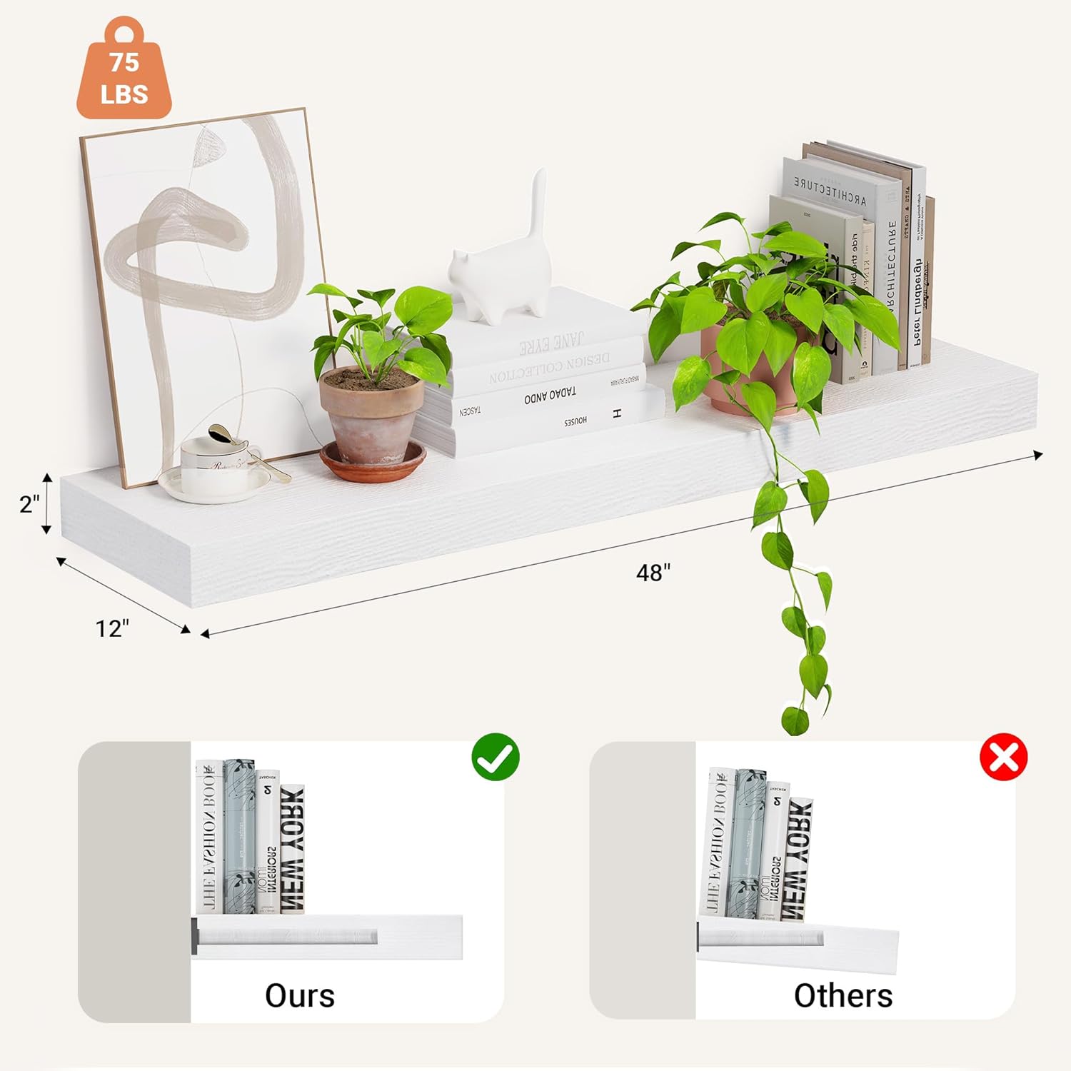 - Deep Floating Shelves- Sized in 48"L x 12"D x 2" H. These extra deeper and thicker wall shelves are 12 inches in depth and 2 inches in thickness instead of the regular narrow floating shelves, wall floating shelves are fixed with solid dual-pipe iron stands and a stable wall shelf It is an ideal place to display your beloved photos, trophies, and other delicate decorations. The bracket has been upgraded from 6.5in to 8in, which greatly solves the problem that the product will sag when installed.