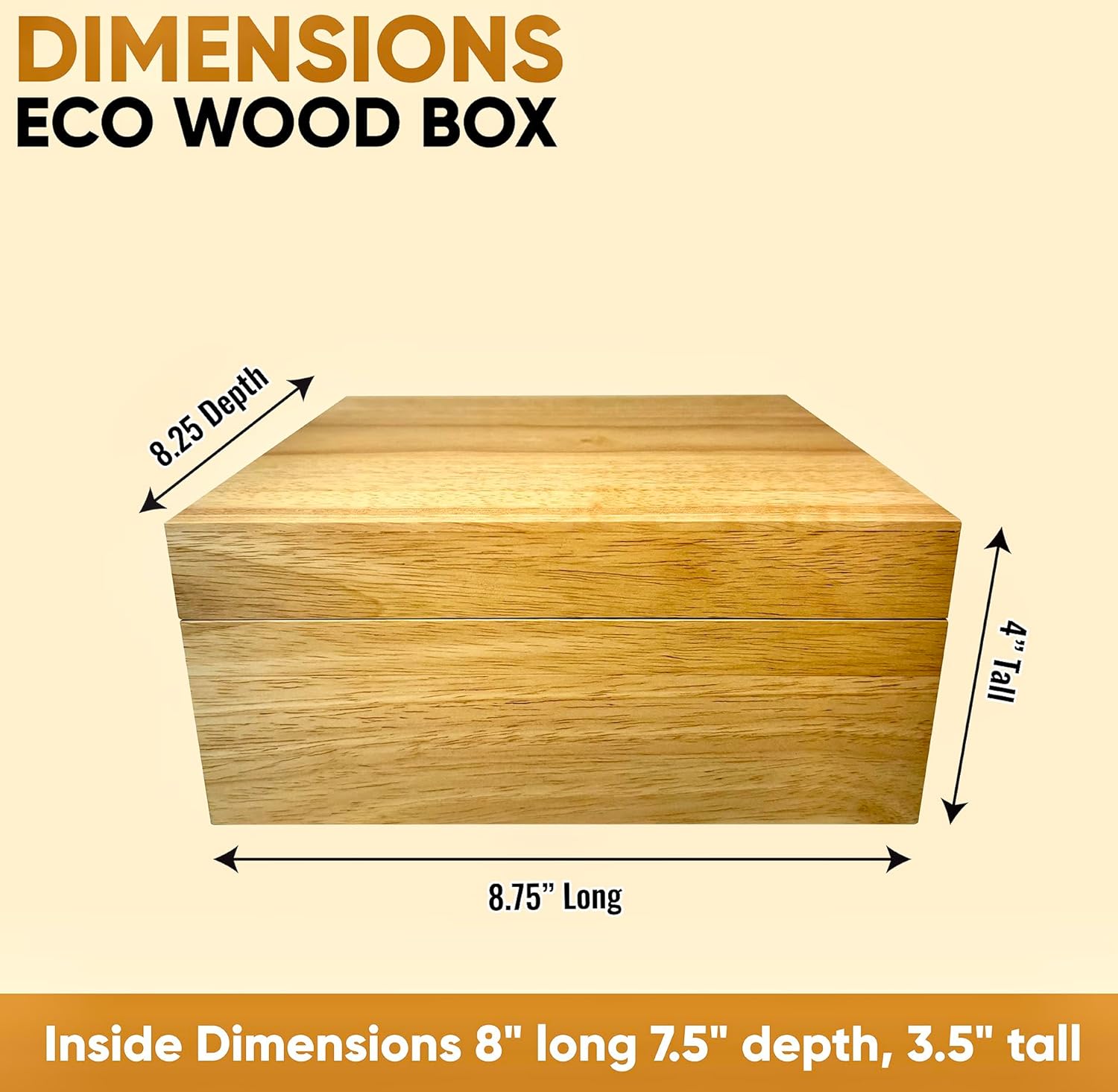 - Sized right for your space! Looks amazing on any table, desk, shelf or countertop!! Dimensions are 8.75” long, 8.25” wide, and 4” tall. Inside dimensions are 8” long, 7.5” wide, and 3.5” tall. Designed to clear up and make space on desks, countertops, drawers, bookshelves and more! Organize and declutter your home with a solid wood eco friendly box!