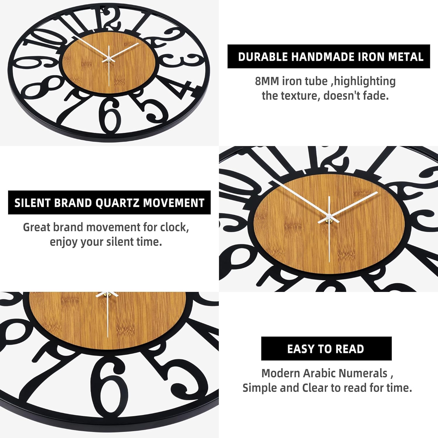 - [Quality Hndmade Clock] -The large black metal clock has a wood face-out retro design. The strength and retro appearance of the Big Number wall clock are ensured by the use of high-quality 2cm thicker handmade iron materials in the handcrafted, metal frame and showing the wooden face.