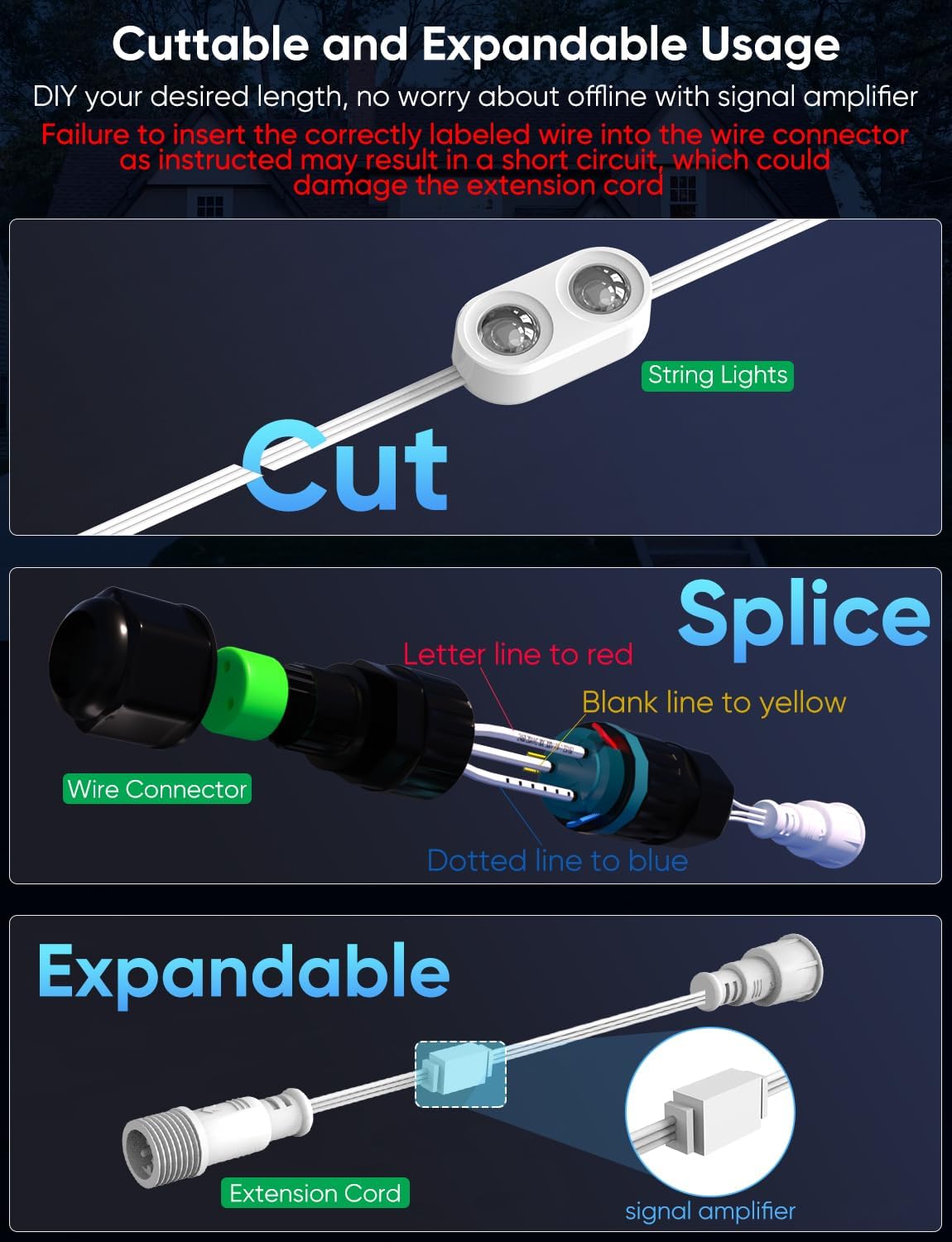 - Cuttable and Expandable: The outdoor permanent lights can be cut and extended by connecting an extension cord through wire connector set when specific area encountered. The extension cord can amplifiy the signal, up to 32.8ft/10m, ensuring that the whole lights set maintains a stable signal. If it is necessary to cut the light string, please refer to the installation guide for the correct installation method.(Failure to insert the correctly labeled wire into the wire connector as instructed may result in a short circuit, which could damage the extension cord with signal amplifier)