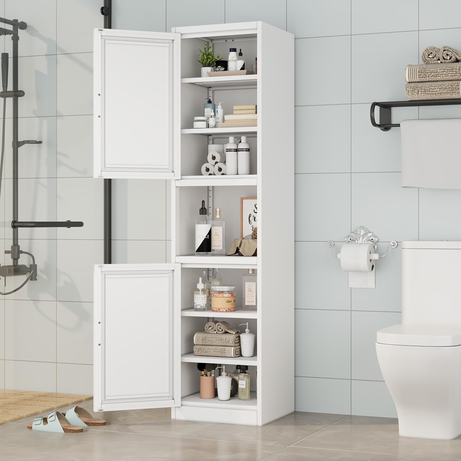 - ๐ใHigh Quality Materialsใ: The storage cabinet is made of high-quality cold-rolled steel. Pantry cabinet adopts a high-quality electrostatic powder layer, which is easy to clean, scratch resistant, and sturdy and durable.