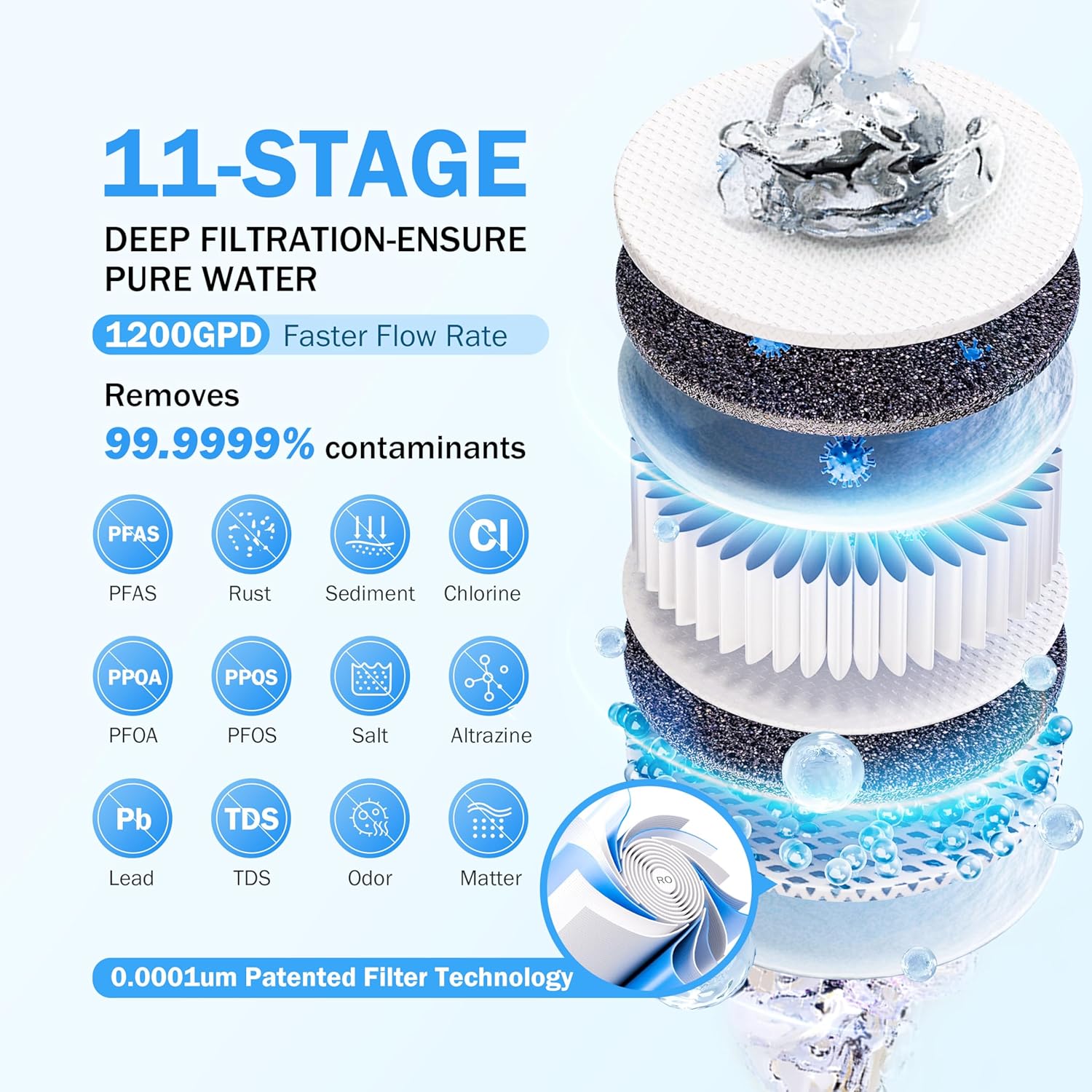 - [11-Stage Filtration & Superior filtration performance] Frizzlief PD1200 reverse osmosis water filter system adopts 11-layers filtration with 0.0001 micron precision. Effective get rid of 1000+ harmful contaminants(99.99%), including Chlorine, Fluoride, Lead, Heavy Metals, Arsenic, Chloramine, TDS, PFAS, PFOA, PFOS, and more.