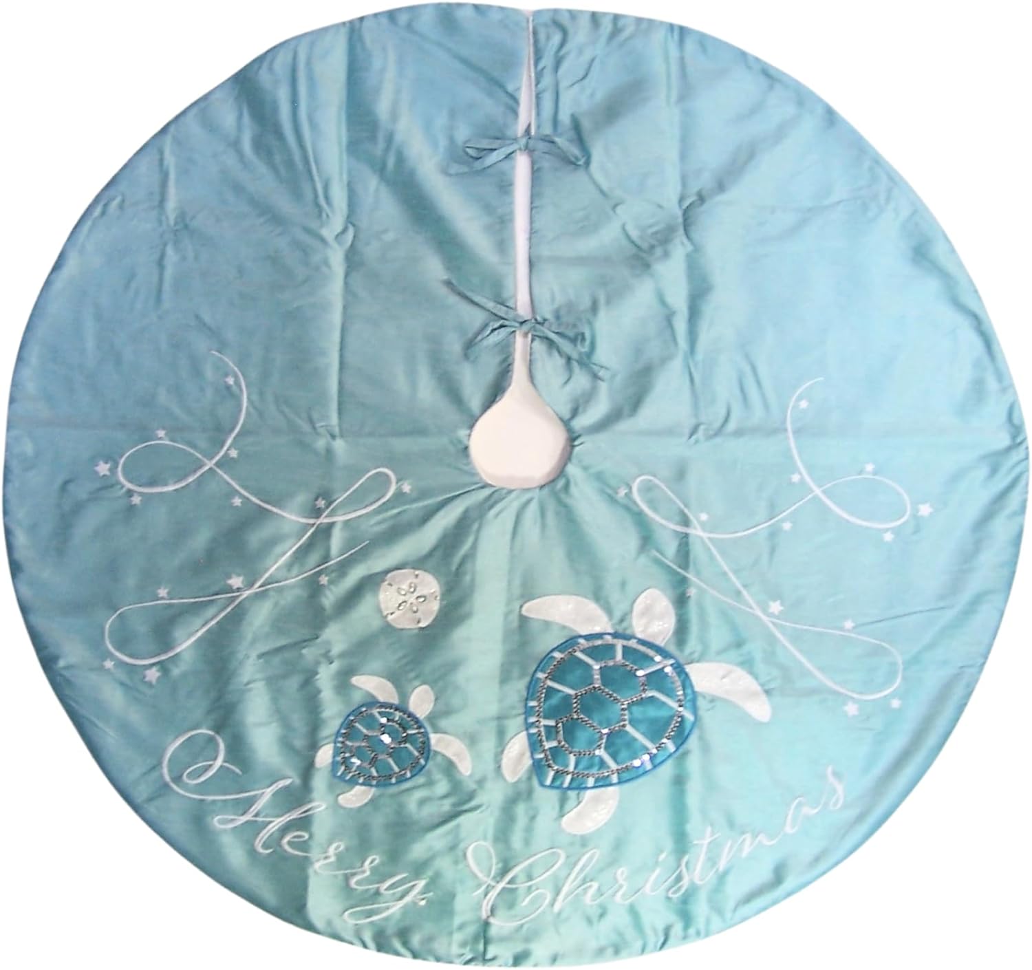 - Festive Design: This 42-inch Christmas tree skirt features a vibrant blue color with embroidered white swirls and sequined turtle appliques for a coastal holiday theme.