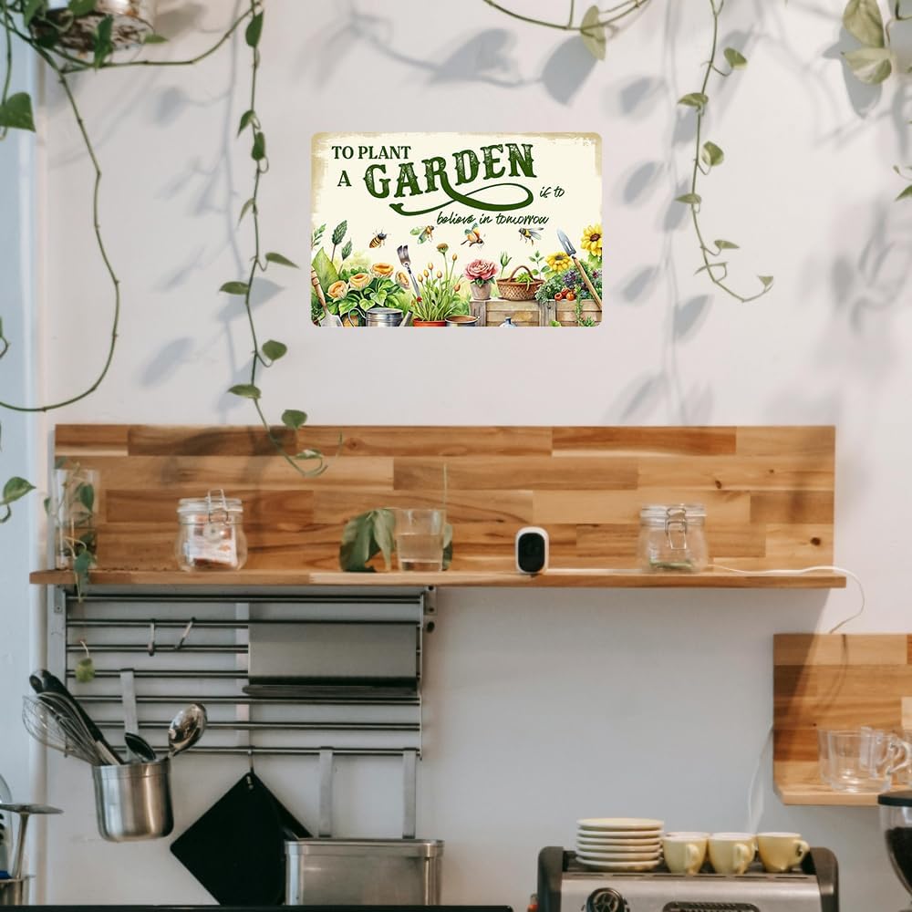 - Garden Sign Vintage Metal Tin Sign Size: 8x12 Inches (20x30 Cm). You Will Receive 1 Be printed To Plant A Garden Is To Believe In Tomorrow Sign Personalized Wall Art Signs Simple And Elegant, And A Humorous Design That Will Bring Laughter To You And Your Friends And Loved Ones!