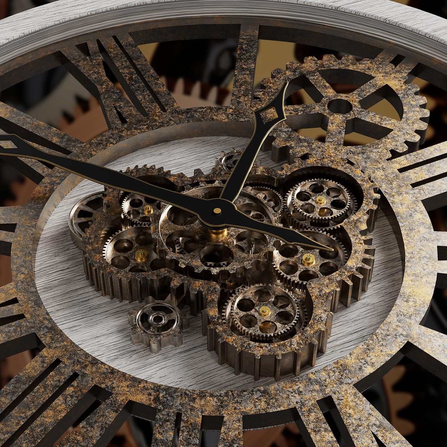 - REAL MOVING GEARS: Large wall clock with unique moving parts is as attractive as it is functional. Put batteries in, various gears start rotating fluently. Moving gear wall clock is amazing looking on the wall and will get so many compliments on it. Made from solid wood and painted by Rust-like color on wall clock create a very rustic and industrial atmosphere. Farmhouse wall clock is professionally handmade and pursuit of naturalness, so it may have some little imperfections.