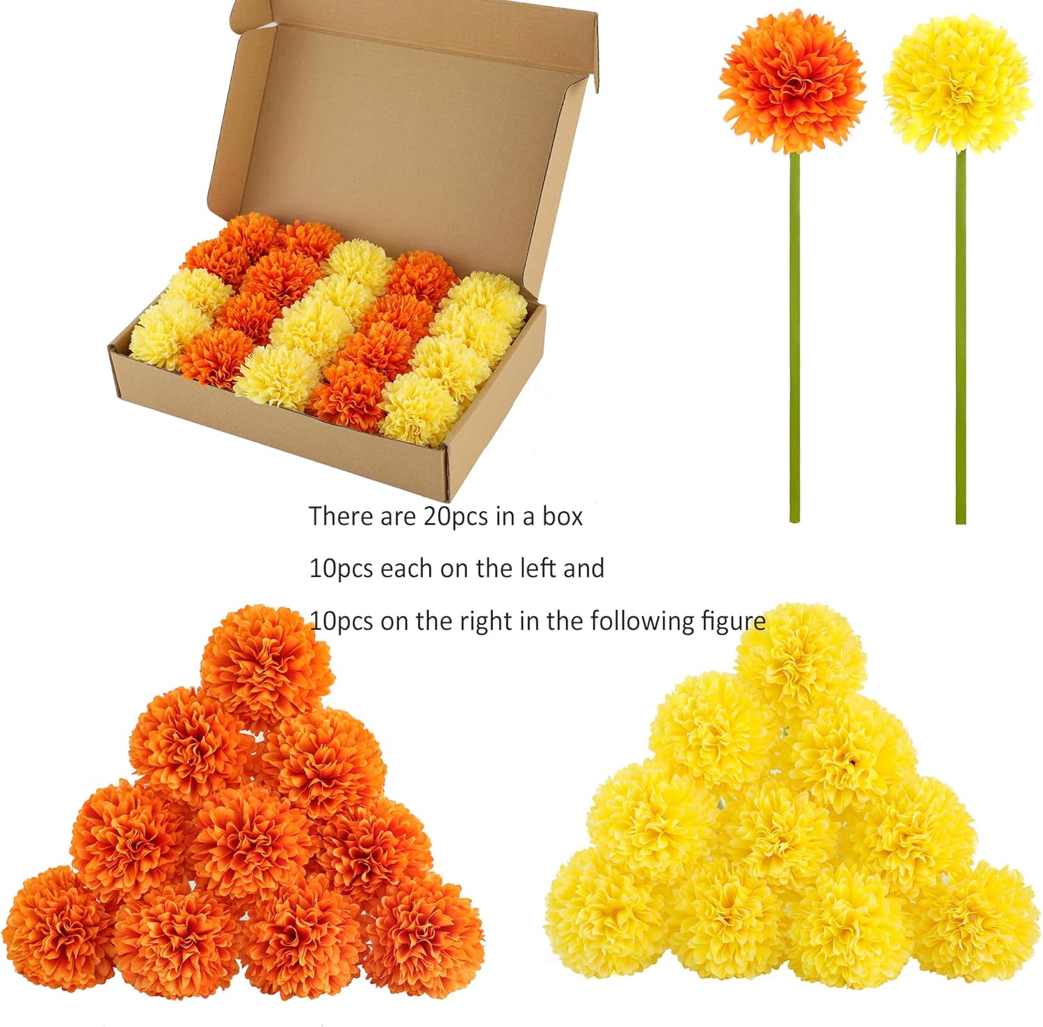 Kimura's Cabin 20Pcs Fake Silk Ball Flowers Artificial Chrysanthemum Faux Mums Bouquets Wedding Arrangements Halloween Home Table DIY Center Decoration (Orange Yellow)