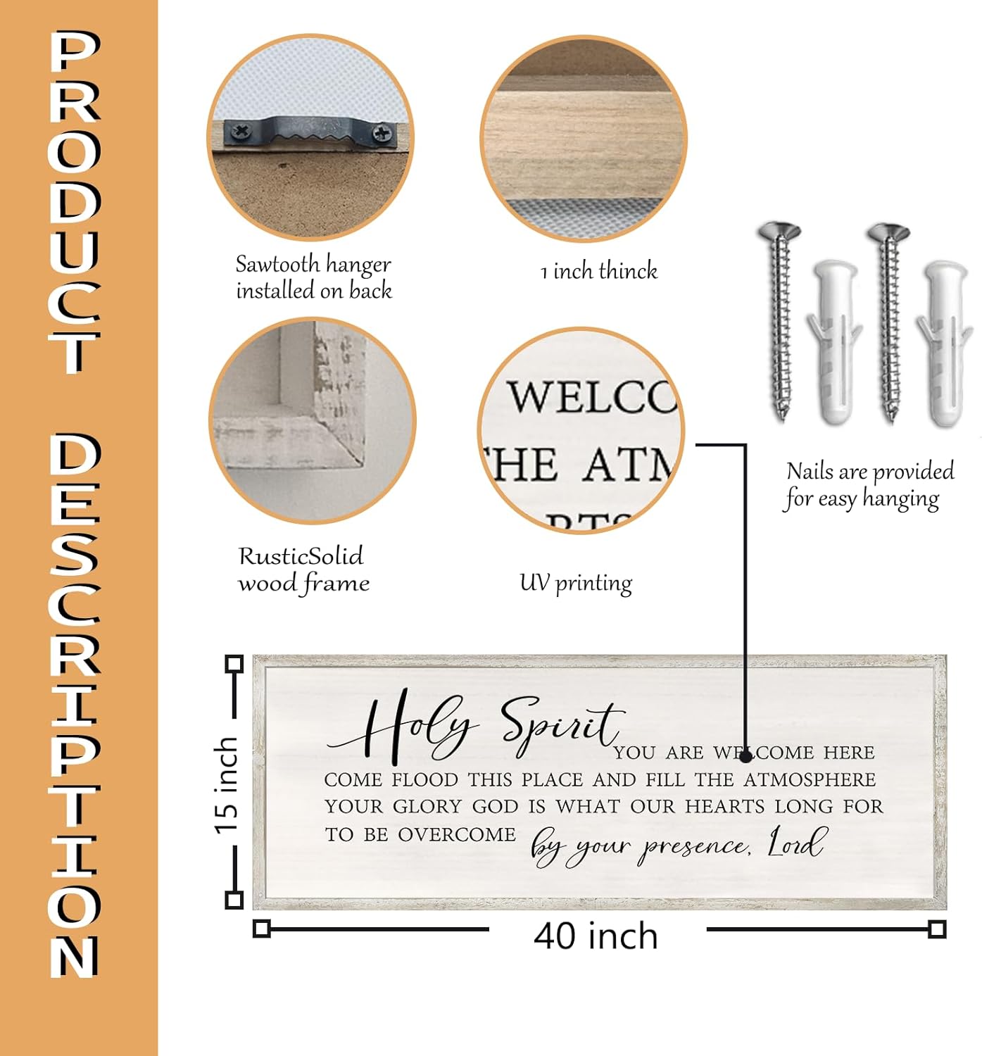 Holy Spirit You are Welcome Here Wall Decor Art 40x15 Inch Large Christian Song Bible Verse Plaque Wood Framed Sign Living Room Scripture Quote Religious For Office Wall Hanging (White)
