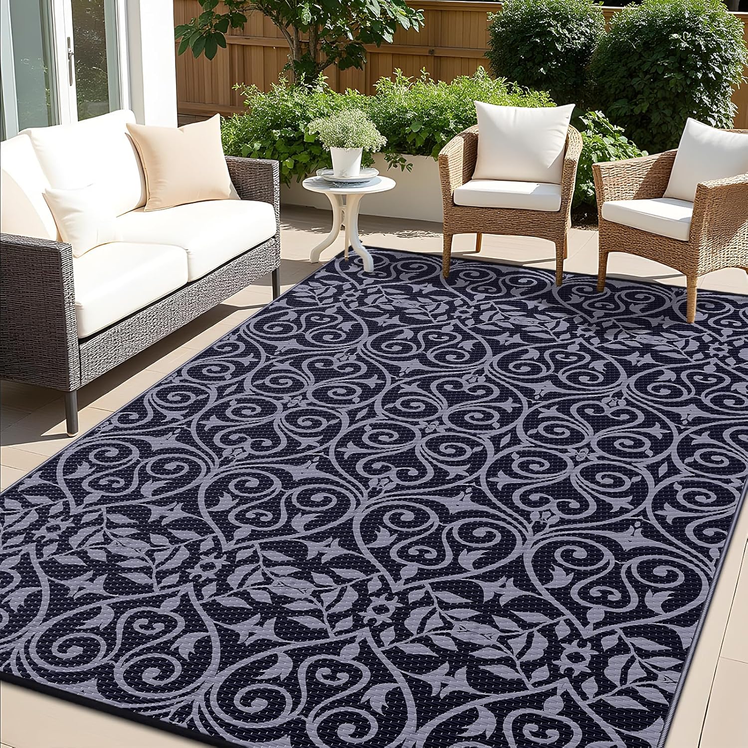 OLANLY Outdoor Rug Waterproof 8x10 ft Clearance, Reversible Outdoor Plastic Straw Rug with Floral Pattern, RV Mat for Patio, Camping, Balcony, Deck, Backyard, Black & Grey