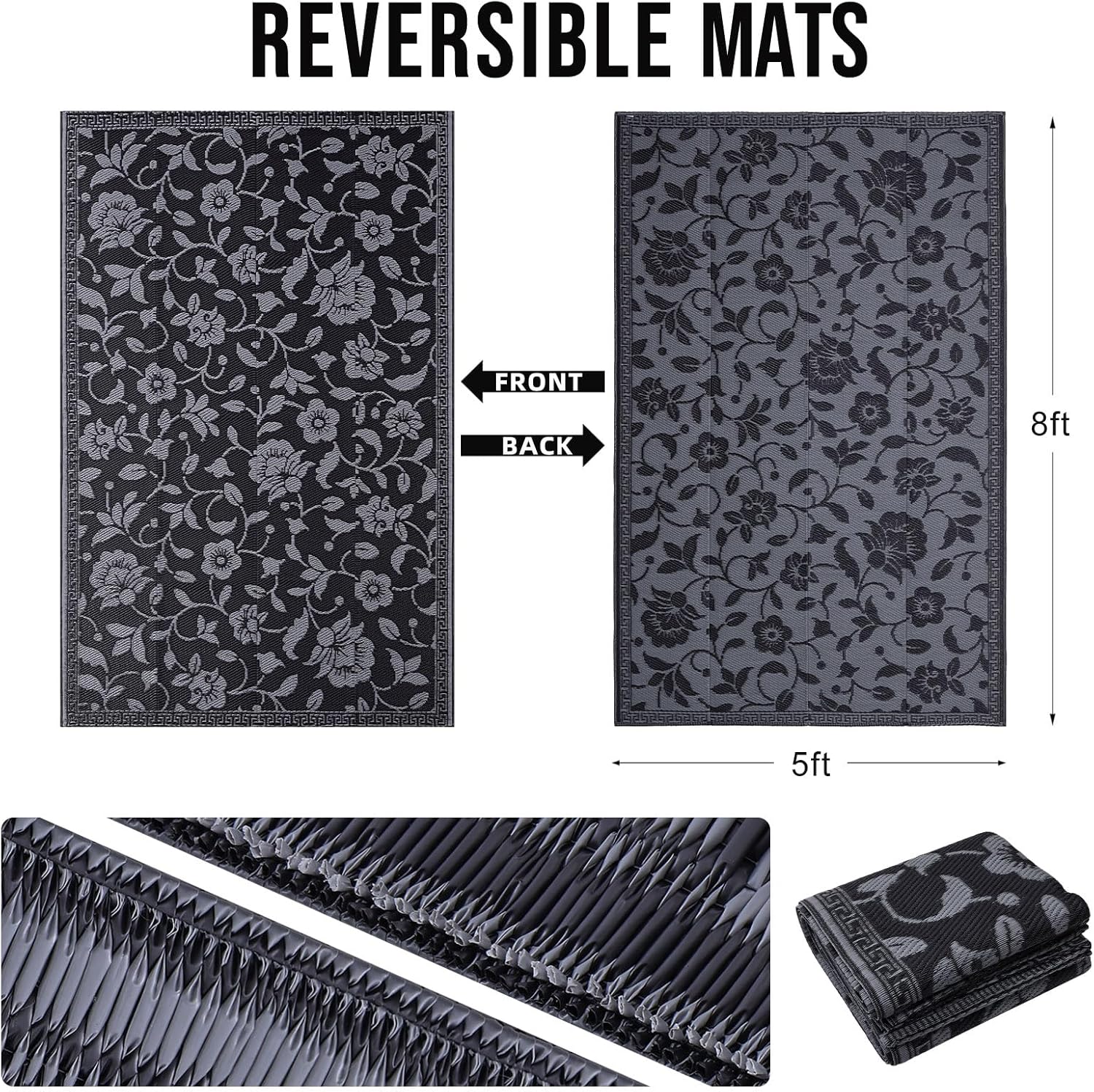 OLANLY Waterproof Outdoor Rug 5x8 ft, Outdoor Plastic Straw Rug with Flower Pattern, Reversible RV Mat for Patio, Camping, Balcony, Deck, Backyard, Black & Grey