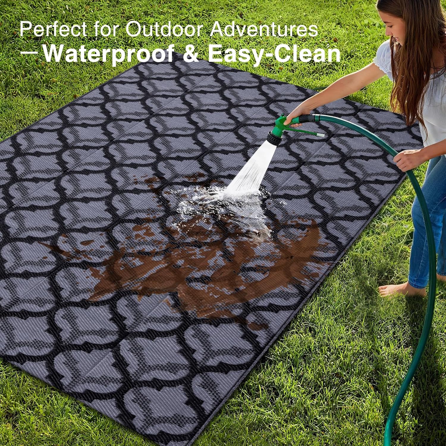 - Stain-Resistant & Easy-Care: Made from tightly woven plastic straws, this 5x8 ft outdoor patio rug ensures liquids drain quickly while solid debris stays on top for easy rinsing. Stains wash away effortlessly, and it dries in no time, making it a hassle-free choice for busy households.