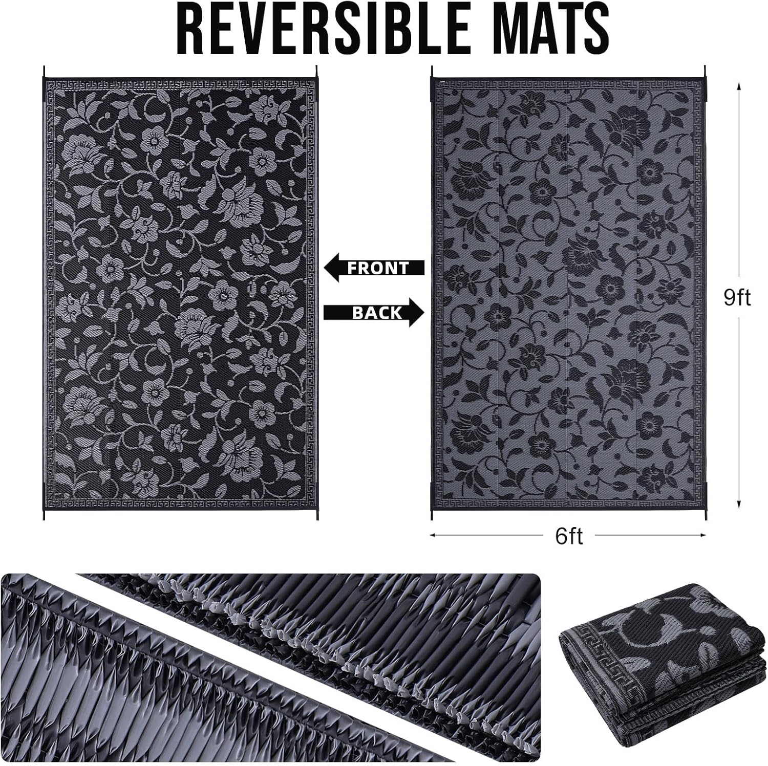OLANLY Waterproof Outdoor Rug 6x9 ft, Outdoor Plastic Straw Rug with Flower Pattern, Reversible RV Mat for Patio, Camping, Balcony, Deck, Backyard, Black & Grey