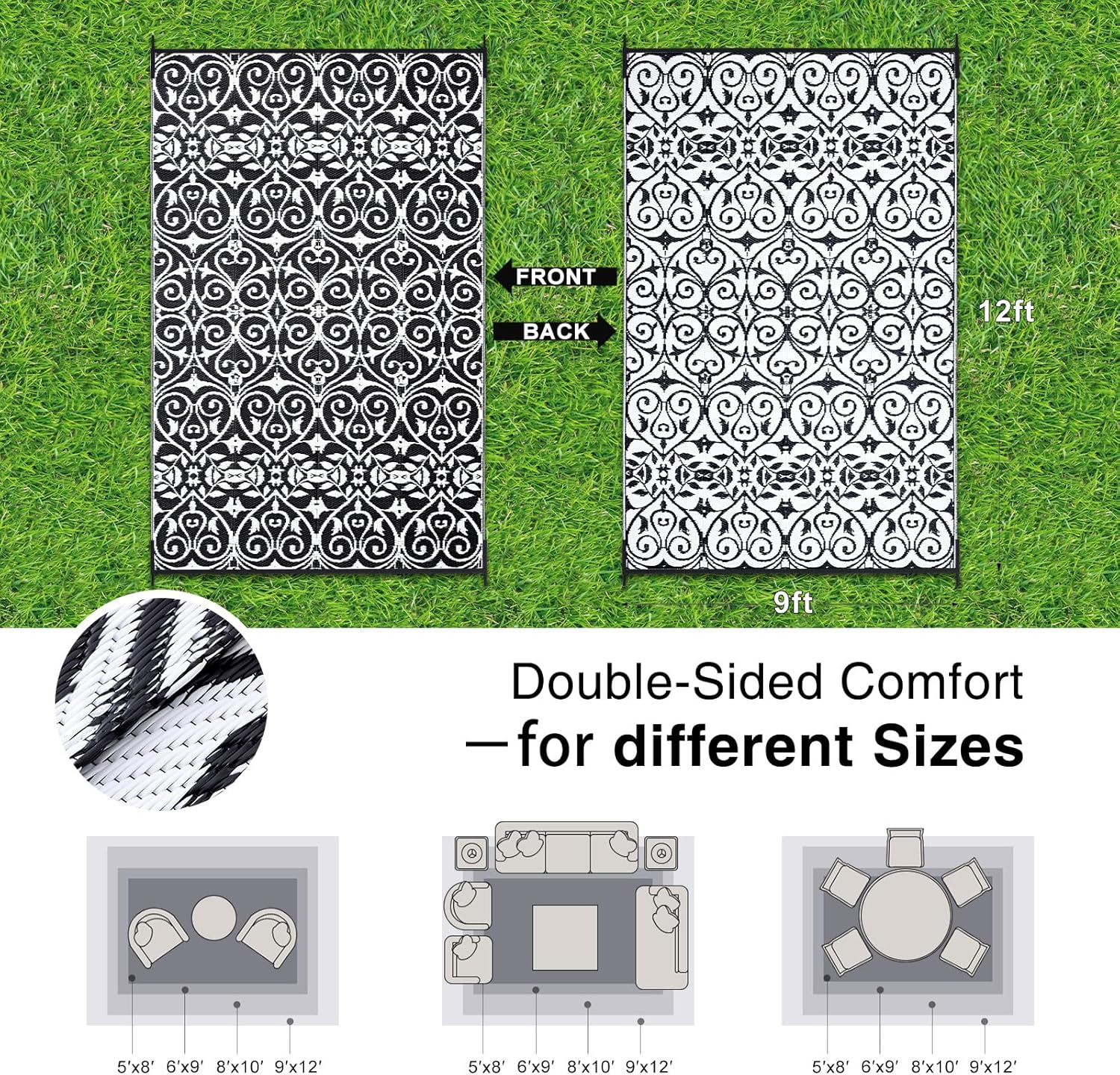 OLANLY Outdoor Rug Waterproof 9x12 ft Clearance, Reversible Outdoor Plastic Straw Rug with Floral Pattern, RV Mat for Patio, Camping, Balcony, Deck, Backyard, Black & White