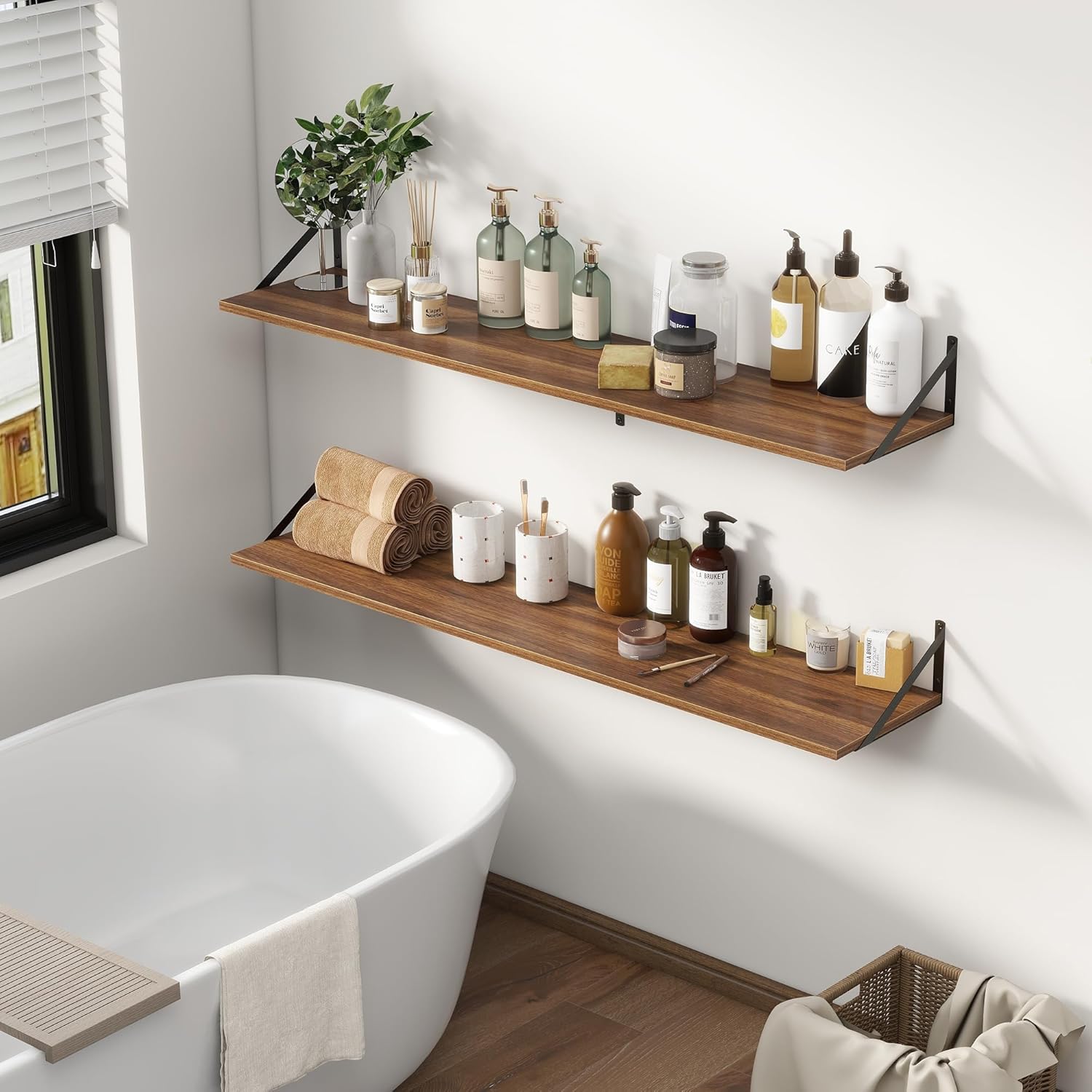 - 【FARMHOUSE RUSTIC WALL SHELF】These floating shelves are made of premium engineered wood board and visible triangular bracket. The rustic wooden grain surface add character and warmth to any modern or traditional interior with these deep floating shelves, contrast shelves at staggering heights on the wall or mount side-by-side or in the corner for a clean streamlined look.