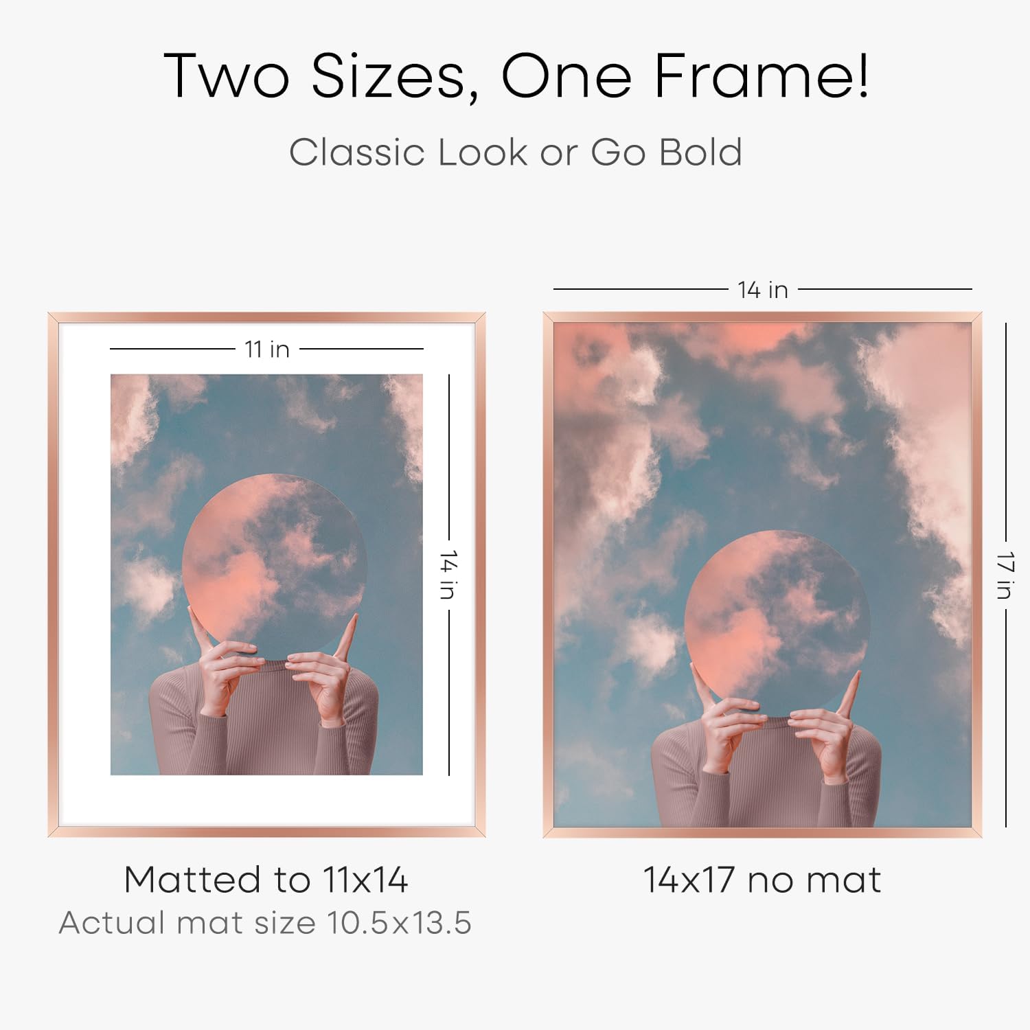 Homeforia 14x17 Picture Frame Rose Gold, High End Metal 14x17 Poster Frames with Mat 11x14 inch Photo, 14 x 17 Rose Gold Frame Matted to 11 by 14 Print, 17x14 Frame, Tempered Glass, Wall Kit, Set of 1