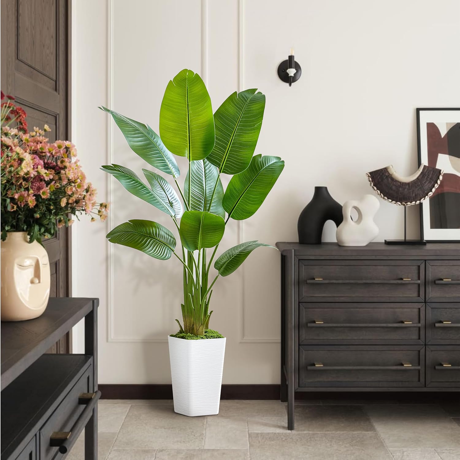 Lifelike Bird of Paradise Silk Artificial Plant Faux Banana Leaf Tree for Home Decor - Perfect Indoor Floor Plant with 9 Trunks (1, White Tall Planter, 5 FT)