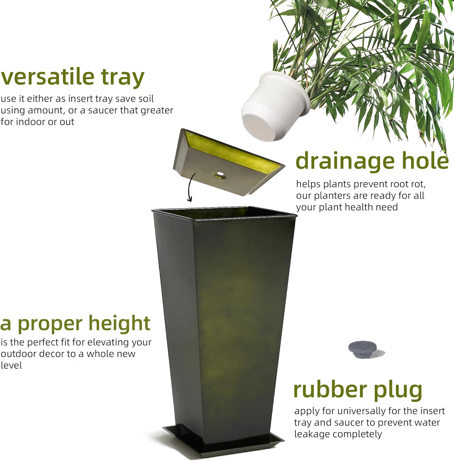 - Dual Purpose Insert: The insert tray can be used as saucer to collect excess water; And each planter comes with a pre-drilled drainage hole, allowing excess water to drain and preventing root rot
