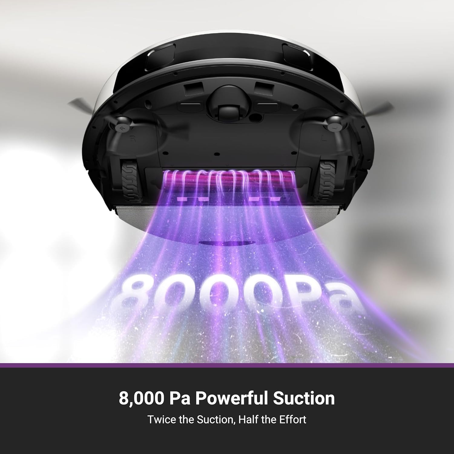 - 【8000Pa Suction Power】A self-developed motor allows the E20 Plus robot vacuum to deliver an impressive 8000 Pa of suction power—a 100%* improvement over the previous model. This substantial increase in power enables the E20 Plus to effortlessly clean the hard floor and carpet more deeply, easy sweeping dust, tangled cat and dog hair, effectively removing deeply.