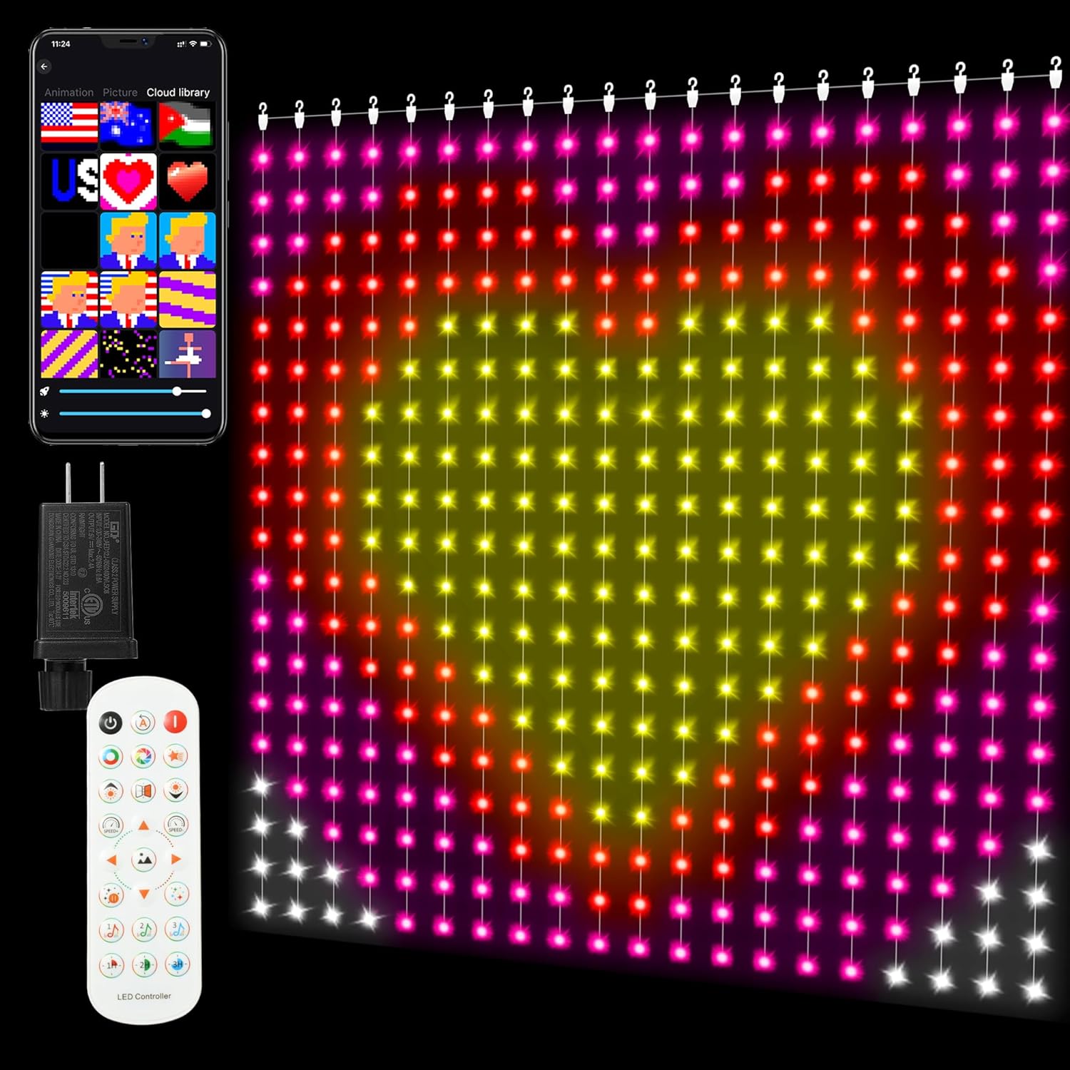 - APP Smart Curtain light& Remote Control:Operate the led curtain lights addressable effortlessly with the included dedicated APP or remote control, the app is easy to pair and use and it is fun to try the different modes and draw your own unique patterns or slogans, giving you full control over brightness, color, effect, and lighting patterns to suit your style. These aesthetic curtain lights will make any event special and memorable