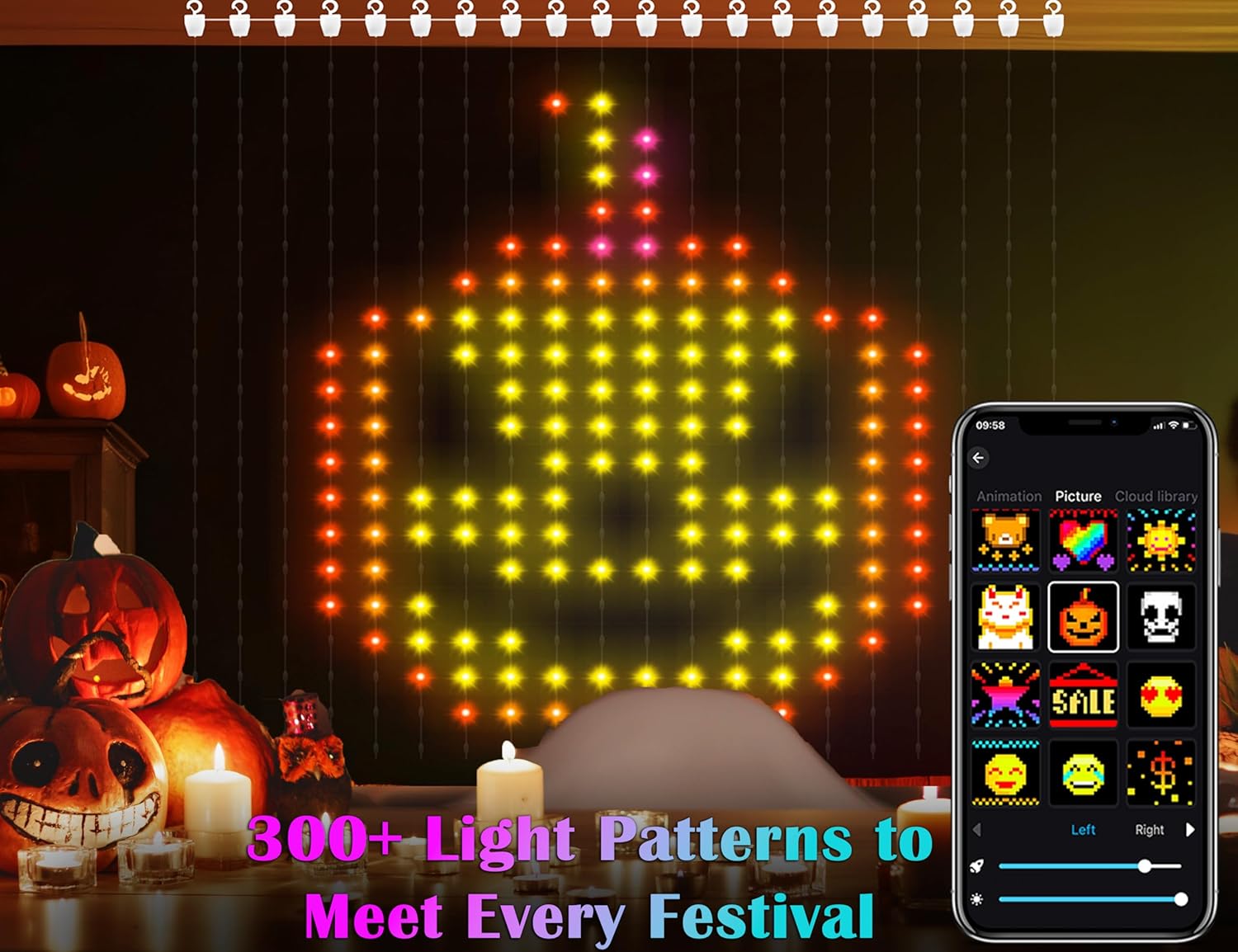 - 300+led curtain lights Patterns animated&Scene Modes: More than 300 pre-set static and dynamic patterns for you to pick, you can find cool light pictures on this curtain fairy lights for every festival. You can choose to display Christmas tree, Gift Box, Santa Claus, Candy Canes, pumpkin, ghost, cat, Heart shapes, American Flag, unicorn, etc. Whether it’s Halloween, Thanksgiving, Christmas, New Year, Valentine’s Day, Easter, Independence Day, these Christmas curtain lights are the ideal decoration. Note: The image will look better with flat wall or background behind the smart curtain string lights