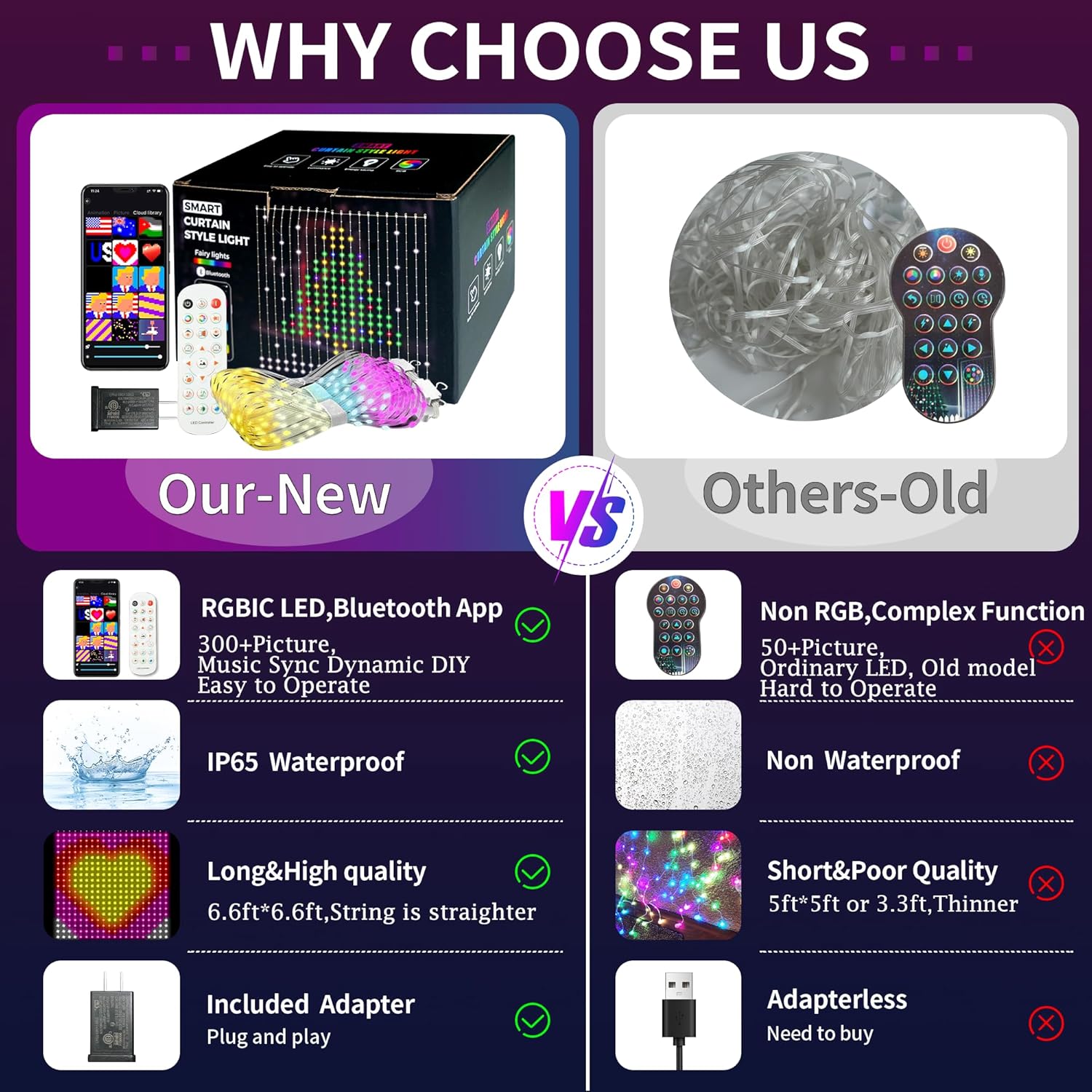- USB&Adapter Plug Powered: Size:6.6FT*6.6FT,Lead wire:9.8Ft.Crafted from premium materials.Setting up your indoor & outdoor Smart Curtain Lights is a breeze. Simply hang them up with the built in hooks, plug them in, and use the remote or app to adjust the settings. This IP65 waterproof curtain lights are ideal for decorating bedrooms, living rooms, walls, backdrops, patios, garden, and more, adding a magical touch to any setting. (Note: The controller and adapter are not waterproof, please seal them for outdoor use