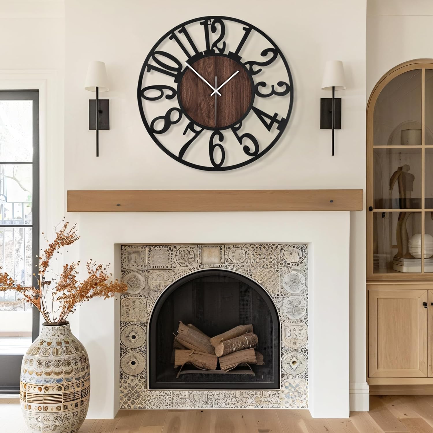 Maxstar Round Wall Clock for Living Room Decor Battery Operated Non Ticking Black Metal Wood Clocks for Home Living Room Garden Office Kitchen Decoration -16 inch