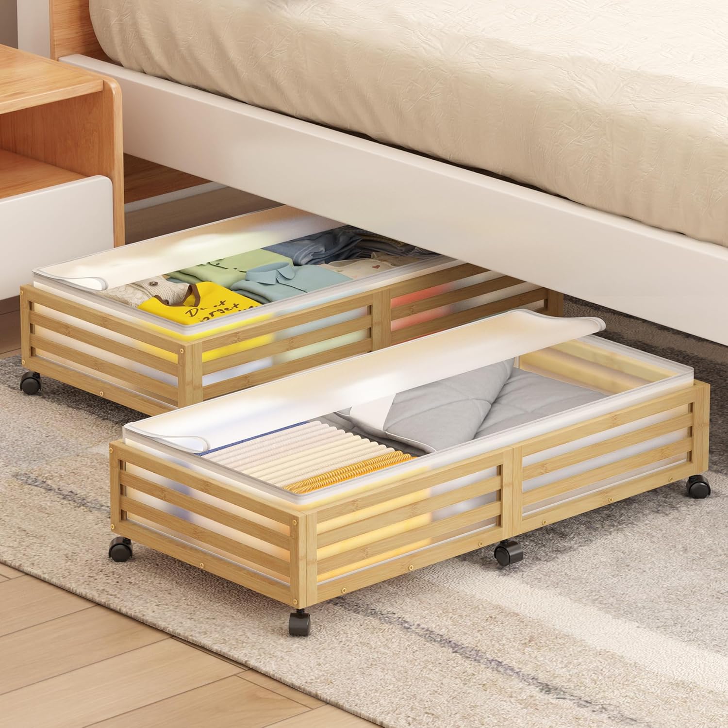 Under Bed Storage with Wheels-Large Bamboo Underbed storage Containers with Large Dust Bag Stackable Under the Bed Shoe Storage Bins for Clothes Books Bedding (2 Packs Nature, 33.07"L×16.54"W× 6.5"H)
