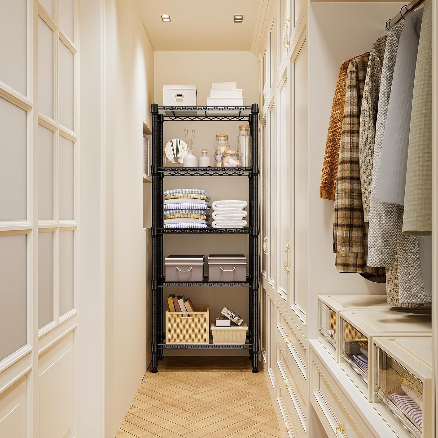 - VERSATILE DESIGN: The shelving units offer incredible versatility. It is suitable for use in a garage, balcony, pantry, and kitchen. Its special coating ensures water resistance, making it accommodated for humid environments like bathrooms