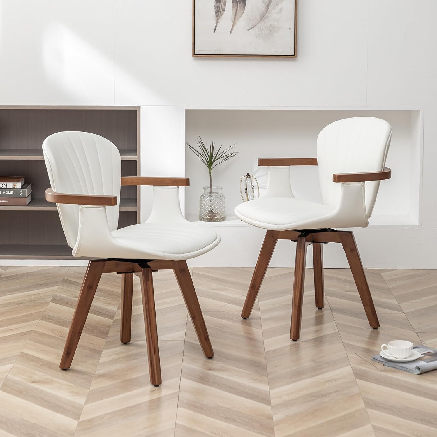 LUNLING Swivel Dining Room Chairs Set of 2,Mid Century Modern White Faux Leather Kitchen Chair with Arms,Bamboo Legs Side Chairs No Wheels,Accent Chair for Dining Rooms and Offices