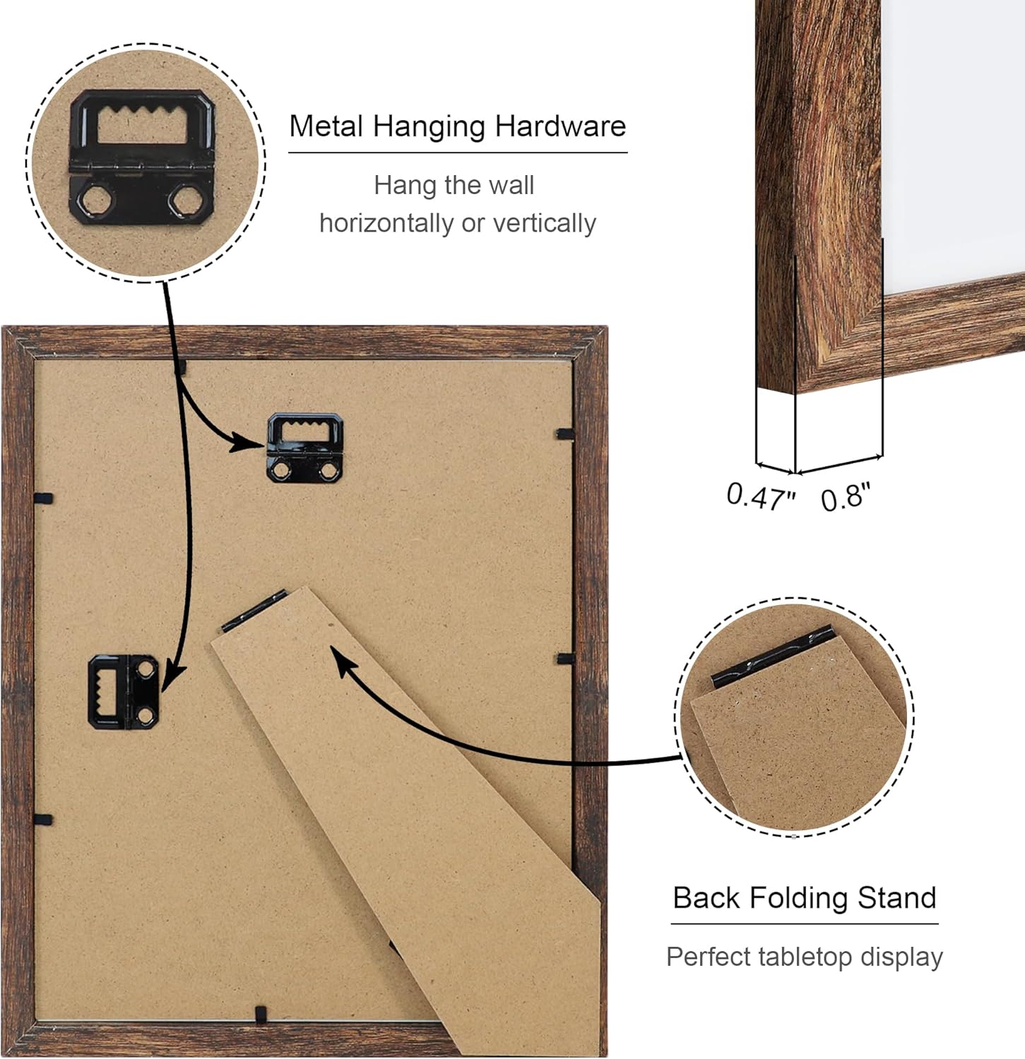 - Multiple Display:8 by 10 photo frames come with hanging hardware, which can be hung horizontally or vertically on the wall, or displayed on the tabletop through the stand