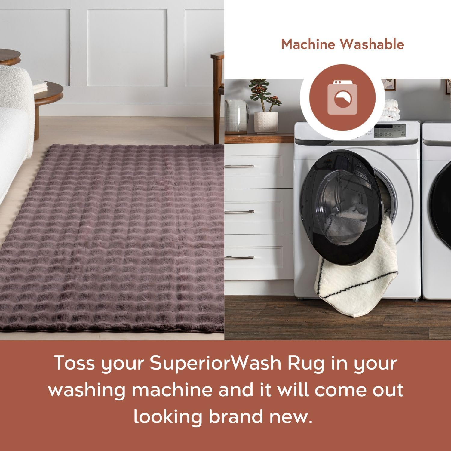 - Machine Washable: When that inevitable “oops” happens, simply place your area rug in the washing machine with cold water on the gentle cycle (do not use bleach). We recommend line drying your rug or without heat on the air-only drying cycle.