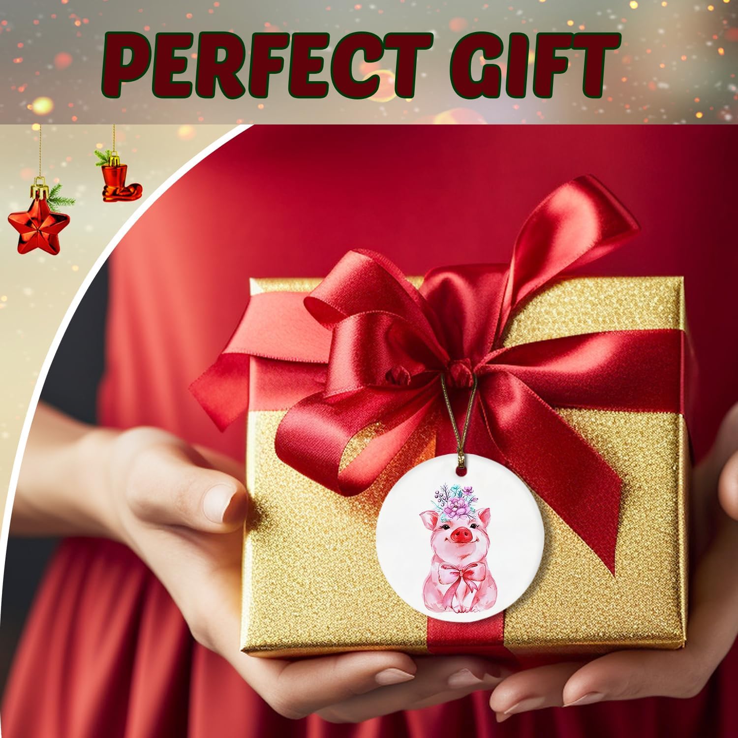 Pink Pig Ornament, Pig Gifts for Pig Lovers Women, Pink Coquette Bow Floral Pig Ceramic Ornaments, Pig Decorative Hanging Ornament
