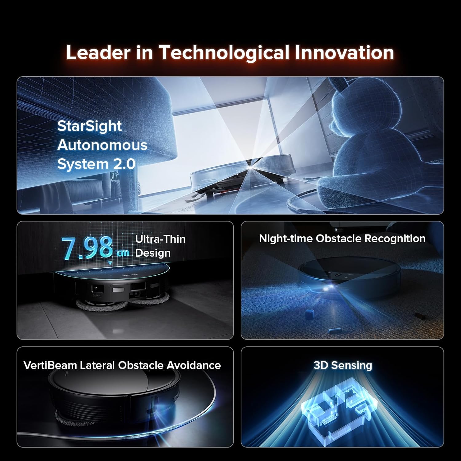 - StarSight Autonomous System 2.0: Experience smarter cleaning with advanced 3D sensing technology, enabling precise mapping even under narrow-legged furniture and suspended cabinets. The innovative VertiBeam Lateral Obstacle Avoidance system navigates cables and irregular furniture with ease, cleaning along cords without manual intervention. Enhanced algorithms detect and adapt to 108 obstacle types, ensuring seamless and efficient cleaning across every corner of your home.