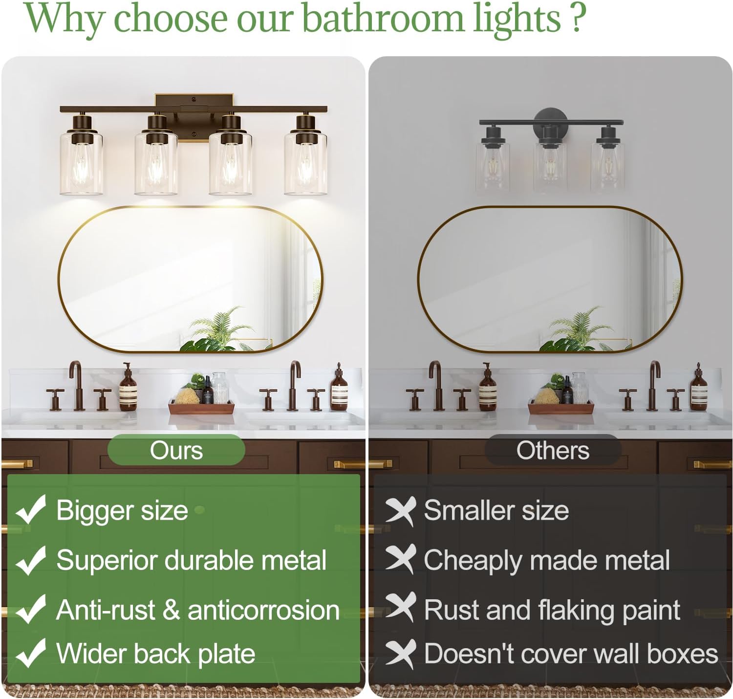 - Elegant Oil-Rubbed Bronze Design - This 4-light bathroom fixture combines a rich oil-rubbed bronze metal body with thick clear glass shades, enhanced by subtle gold accents. The blend of brown and gold adds a touch of classic elegance to its modern frame, making it perfect for farmhouse, contemporary, or traditional decor.