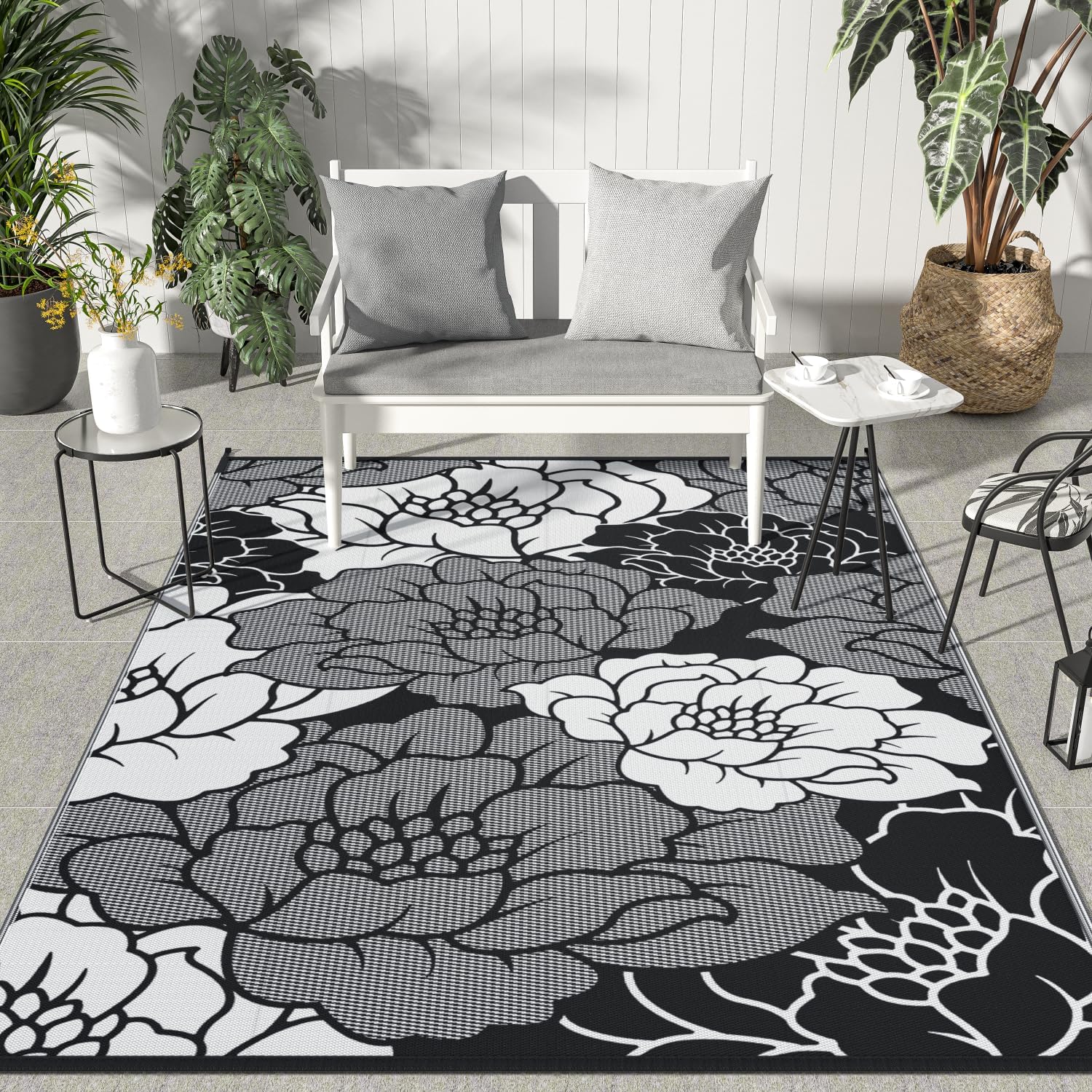 GENIMO Outdoor Rug Waterproof for Patio Decor, 9' x 12' Reversible Plastic Straw Floral Camping Carpet, Large Area Rugs Mats for RV, Camper, Deck, Balcony, Porch, Beach, Picnic, Mix-Black & White