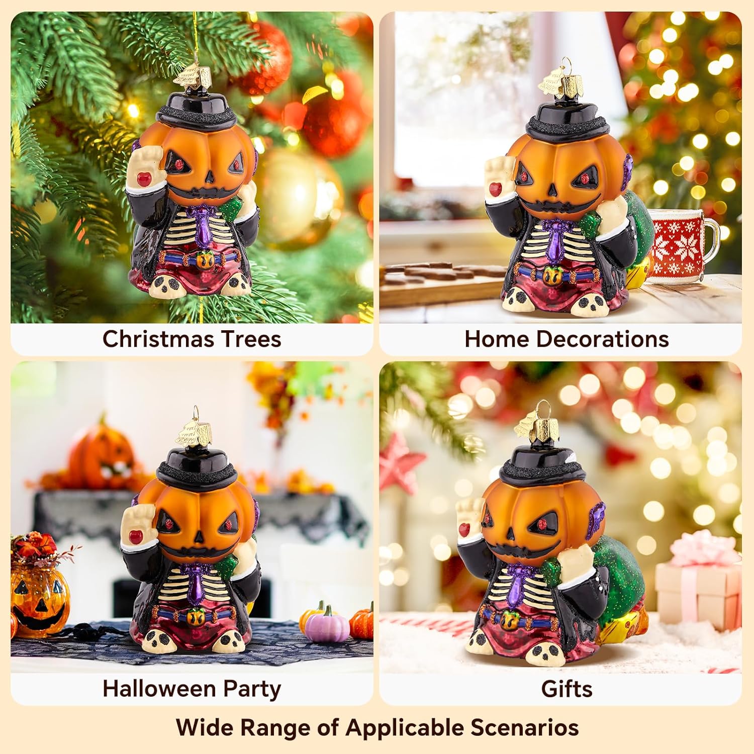 - Full of Festive Atmosphere: Glass ornament is inspired by Pumpkin Jack, which represents a traditional symbol of Halloween, especially the origin story of the Jack-O-Lantern. The naughty Pumpkin Jack is carrying a big bag full of candies, inspiring imagination and pleasing the senses, making it suitable for the Halloween Christmas theme; with glitter, it provides a stunning sparkling appearance under the light, adding a charming touch and textured