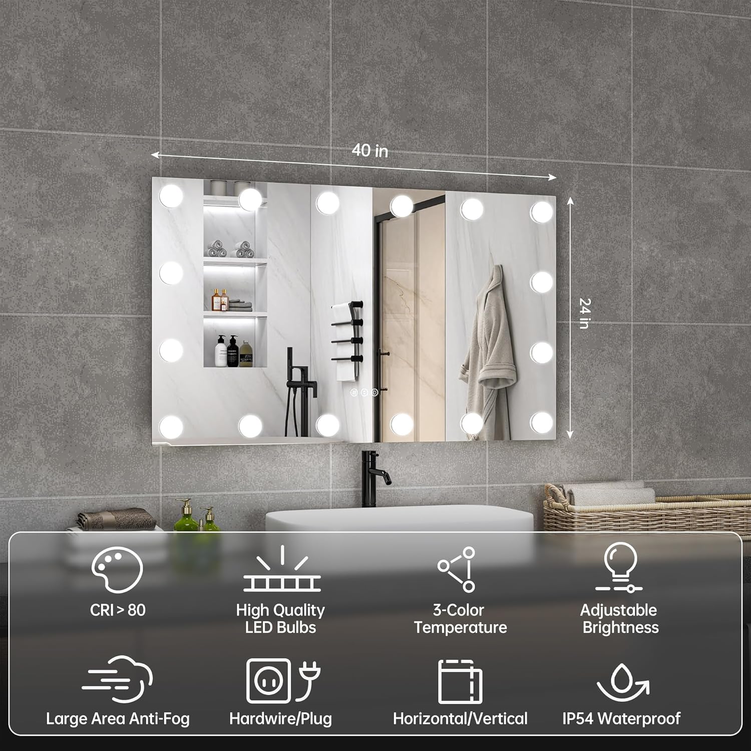 Hasipu LED Bathroom Mirror with Lights, 40" x 24" Hollywood Wall-Mounted Bathroom Mirror with 16 Dimmable Bulbs, 3 Colors Modes, Touch Control, Anti-Fog, Memory Function, Shatter-Proof, ETL Listed