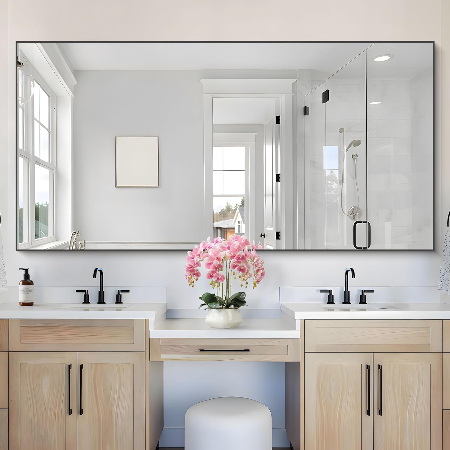 - MULTI-SCENES: Large bathroom mirror is the ideal size to place above the bathroom sink, thin frame will make your whole room unique and elegant, black bathroom mirror is a good choice to decorate your bedroom, living room, hair salon, etc.