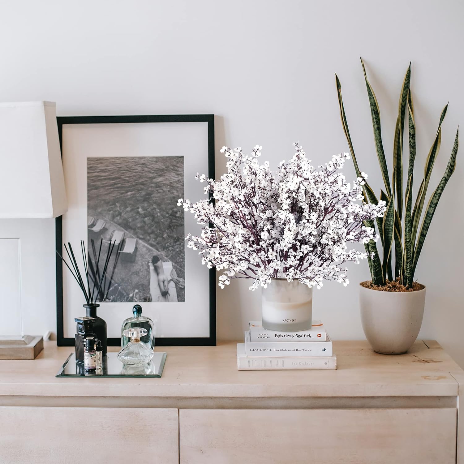 - [PREMIUM MATERIAL]: The babys breath artificial flowers are made of environmentally friendly plastic and silk, wire wrapped with plastics is used for firmness and angle-adjustable in creating the stems.