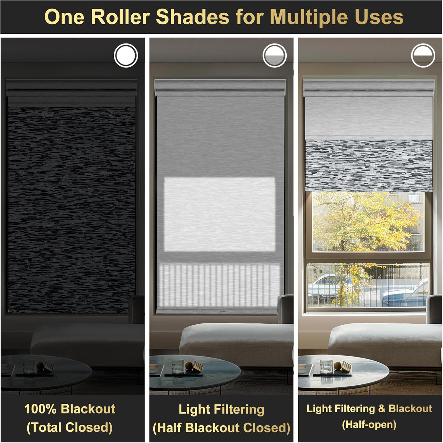 - MULTI-PURPOSE SHADE:Dual roller shades consisting of blackout and light filtering shades, blackout roller shade can 100% blackout,thermal insulation and UV Protection,so that you can experience quiet and comfort of the night during daytime;Light filtering roller shade allow light to filter into your room,and no glare,soft diffused light allow for perfect balance of light and darkness,and also enhances overall aesthetics of your home,allowing for a romantic and comfortable living environment.