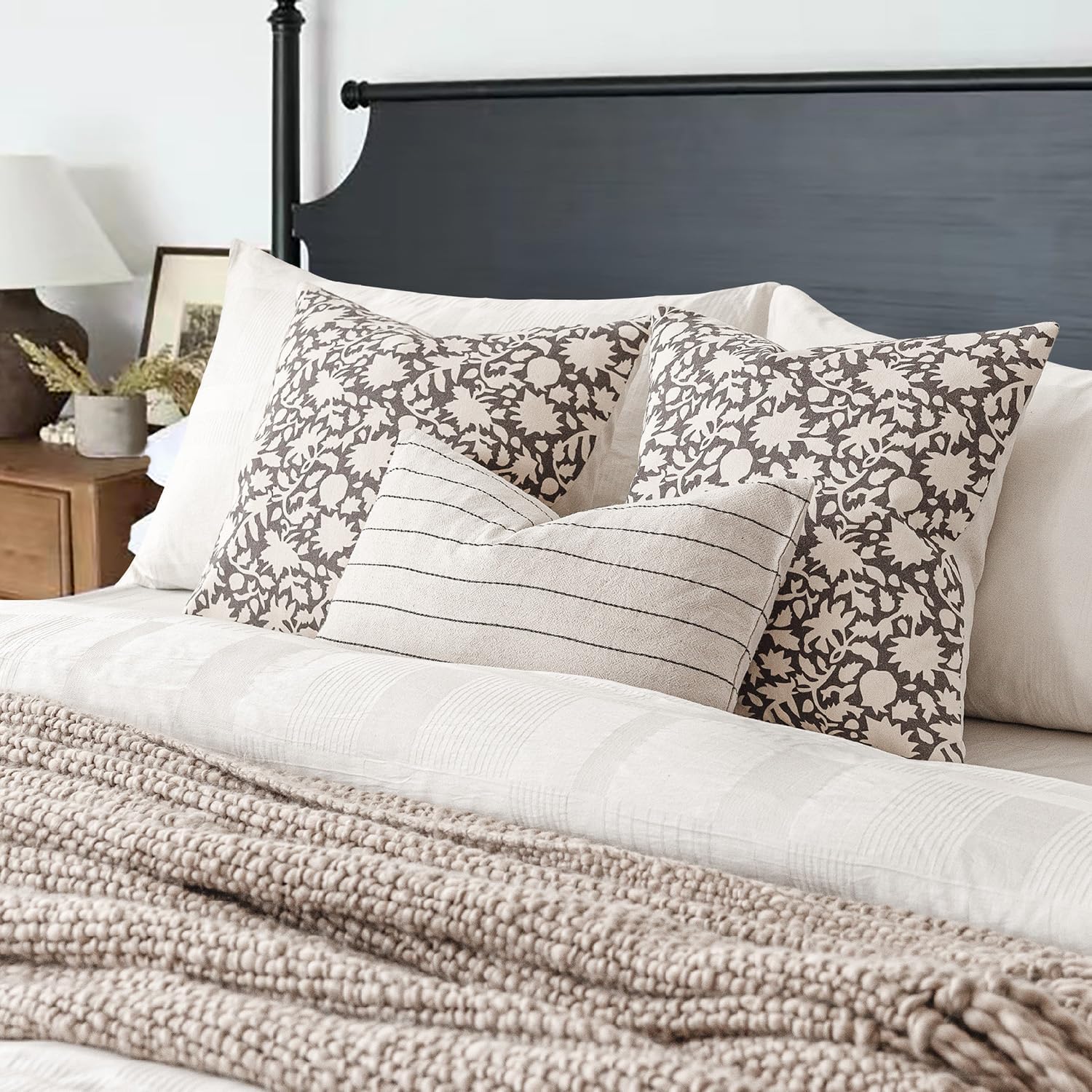 Foindtower Set of 2 Decorative Neutral Floral Throw Pillow Covers Accent Farmhouse Cushion Covers Boho Vintage Pillowcase for Couch Sofa Bedroom Living Room Home Decor Outdoor,24×24 Inch,Rustic Gray