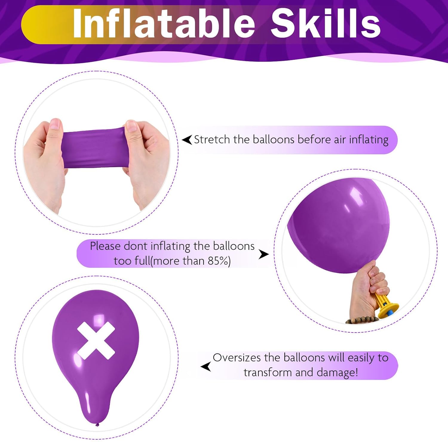 - Warm Tips: Please avoid exposing birthday balloons to direct sunlight before use to avoid affecting the quality and life of the balloons bulk; During the inflation process: Please inflate the globos into a round shape to prevent the helium balloons game from bursting; Choking Hazar: Adult supervision is required; Keep uninflated assorted balloons away from children