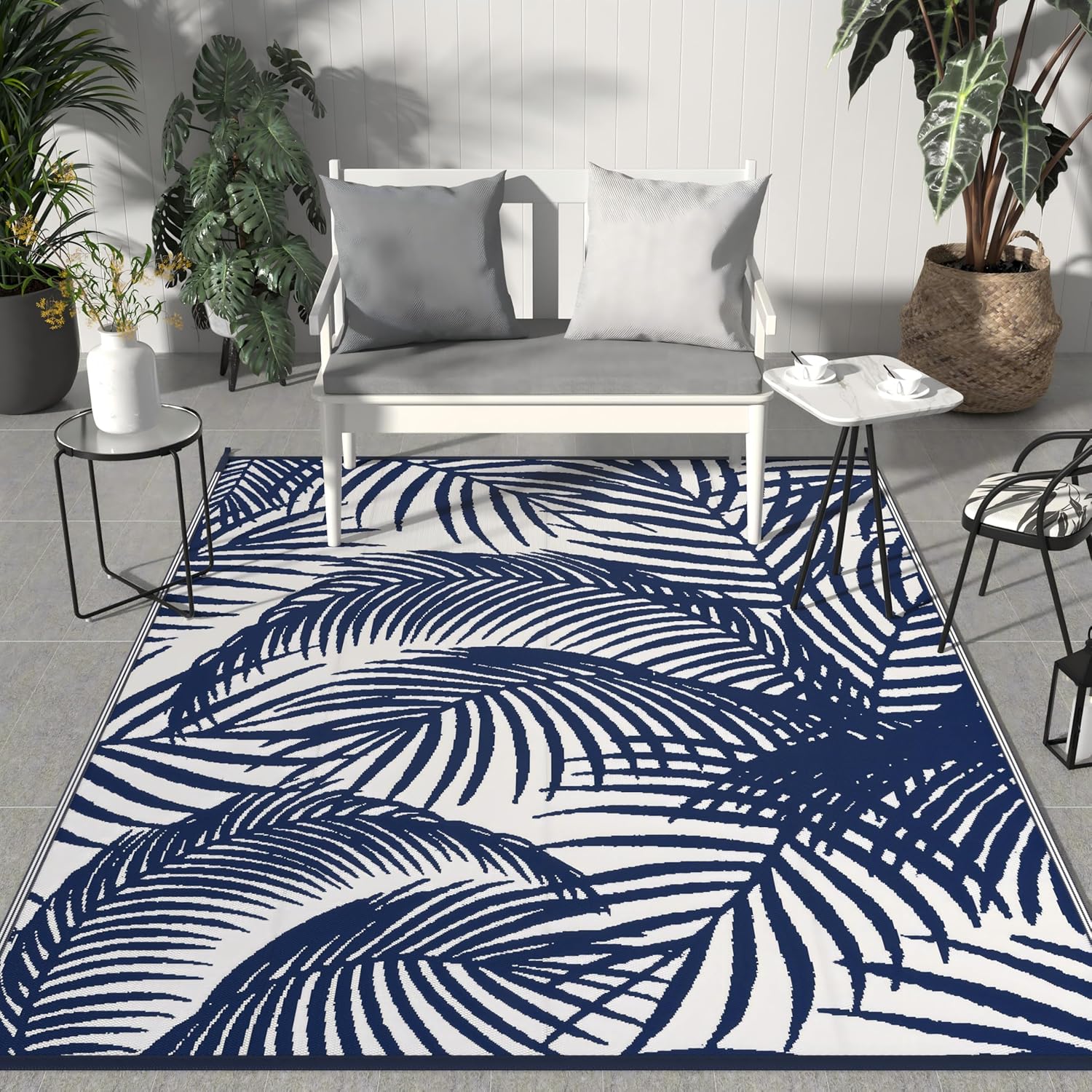 GENIMO Outdoor Rug 5' x 8' Waterproof for Patio Clearance, Reversible Plastic Straw Camping Carpet, Lightweight Mats for Rv, Backyard, Deck, Porch, Picnic, Beach, Balcony, Blue & White