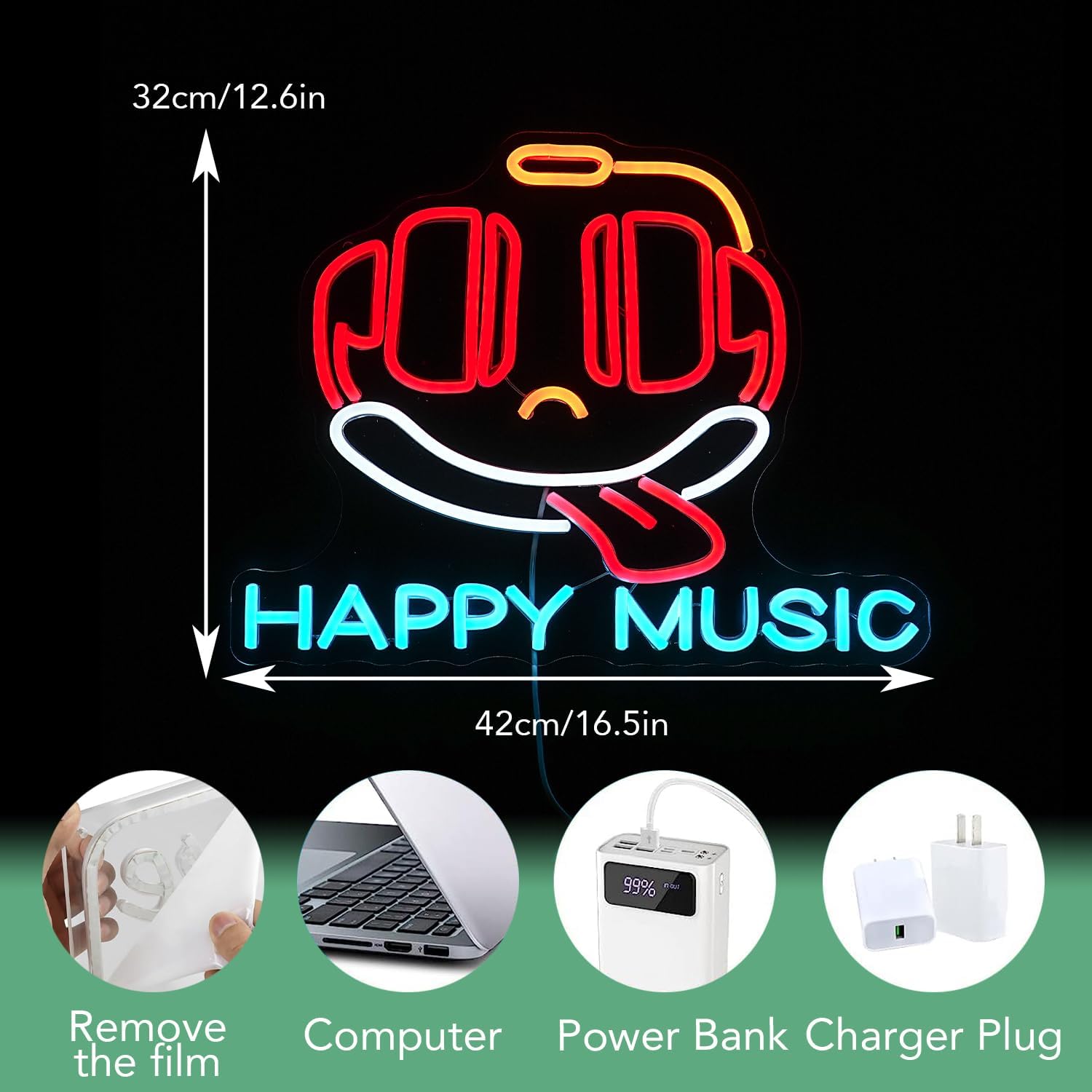 Headphone Neon Sign Dimmable Led Happy Music Neon Light for Wall Decor USB Cute Headset Figure Neon Light Sign for Music Studio Bar Live Music Party Bedroom