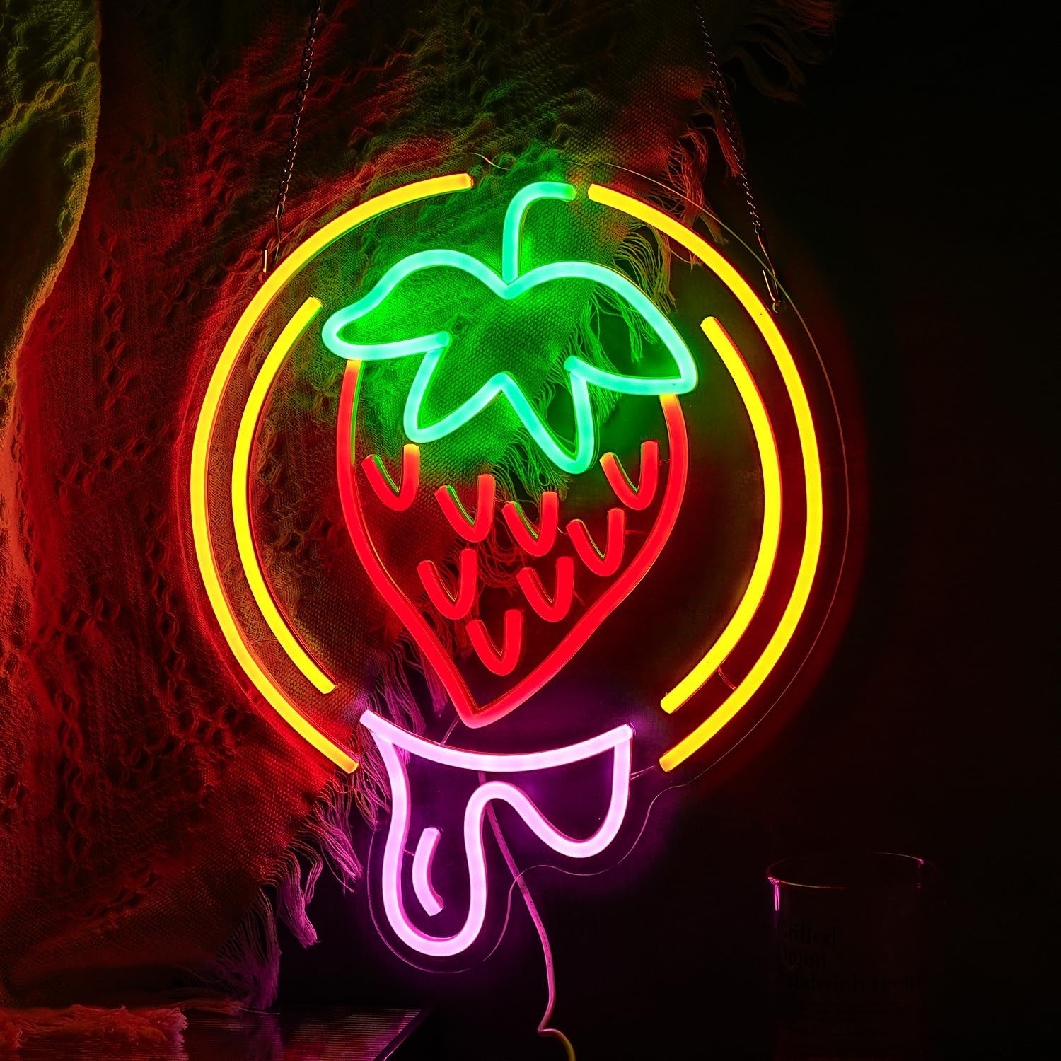 - Straw Light Decoration: The bright and colorful strawberry neon signs are a creative design that combines sweetness and deliciousness, emitting a sweet and warm glow that is eye-catching and suitable for home space decoration, fruit supermarkets, dessert shops, farms, restaurant sign decoration, and warm atmosphere