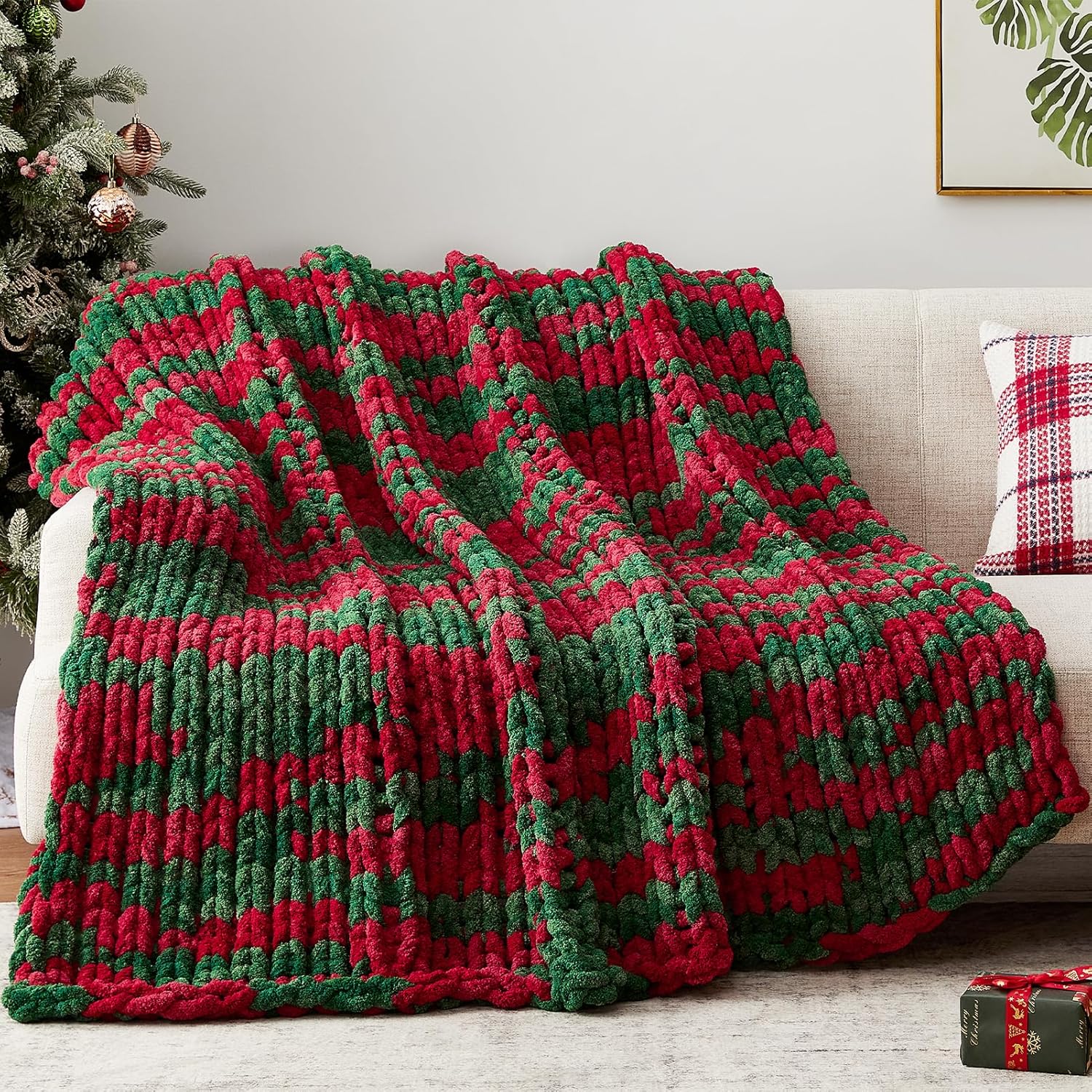 Chunky Knit Throw Blanket, 50''*60'' Knitted Throw Chenille Yarn for Bed Couch, Handmade Stripe Crochet Big Thick Blanket, Machine Washable Cute Comfy Blanket for Home Decor