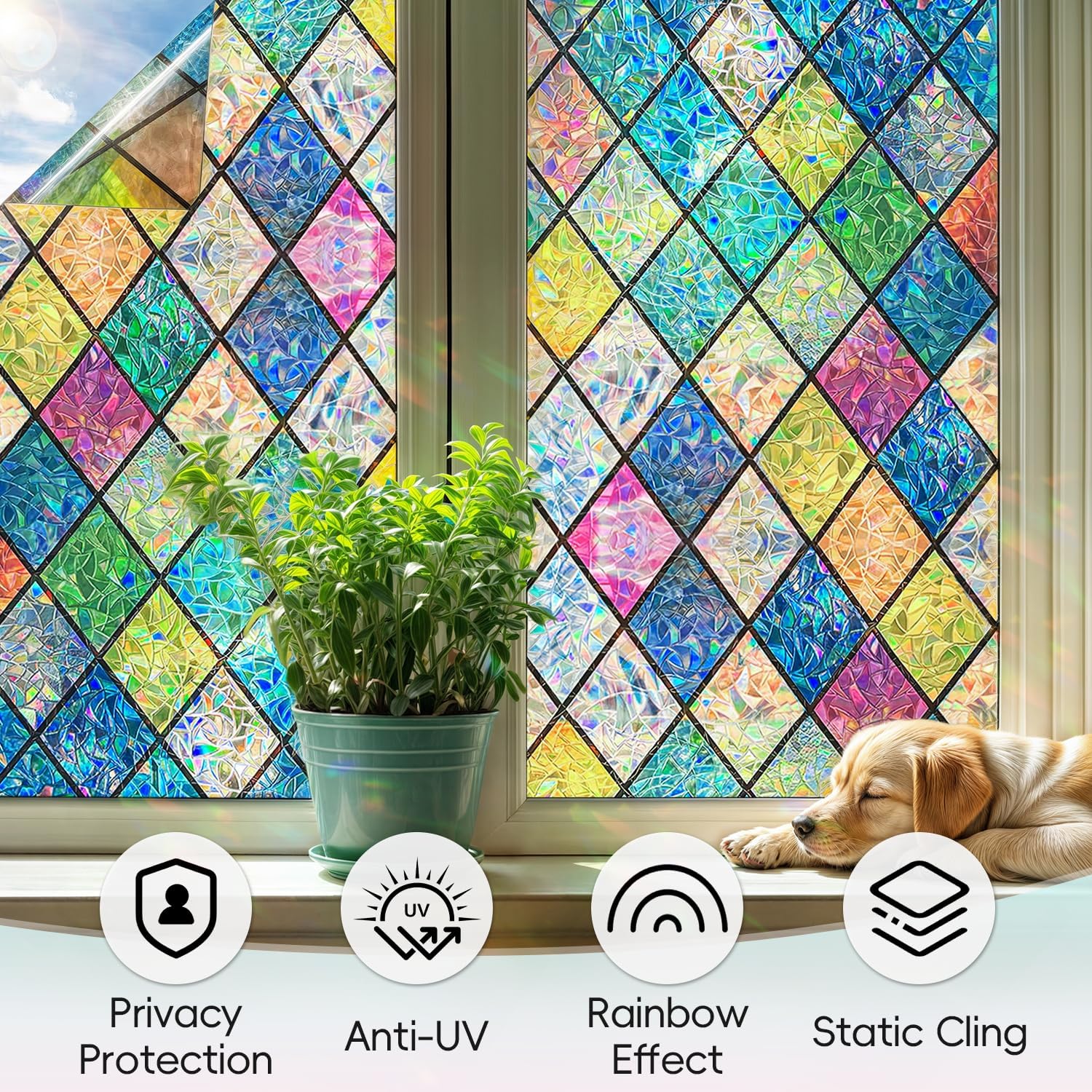 DUOFIRE Stained Glass Window Film Decorative Window Privacy Film Rainbow Diamond Grid Colorful Lattice Windows Cling Anti UV Static Cling Reusable Windows Decal for Home 23.6×78.7 inch