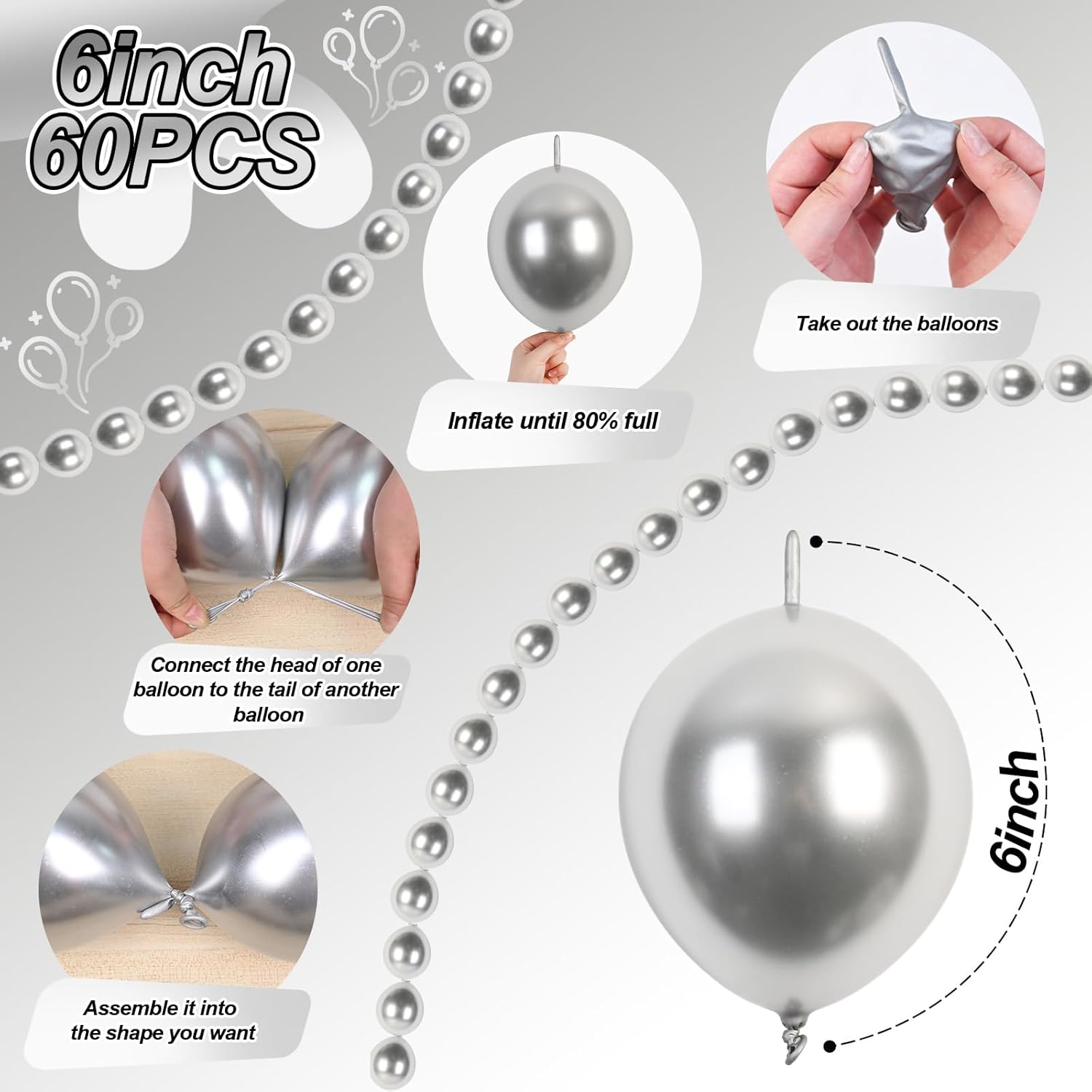 - ๐ซBalloon Chain Garland - You will receive 60 pcs of 6 inch metallic chrome silver link balloons. Our linked balloons have a unique tail design that allows balloons link to be easily. More convenient and easier to assemble than regular balloons.